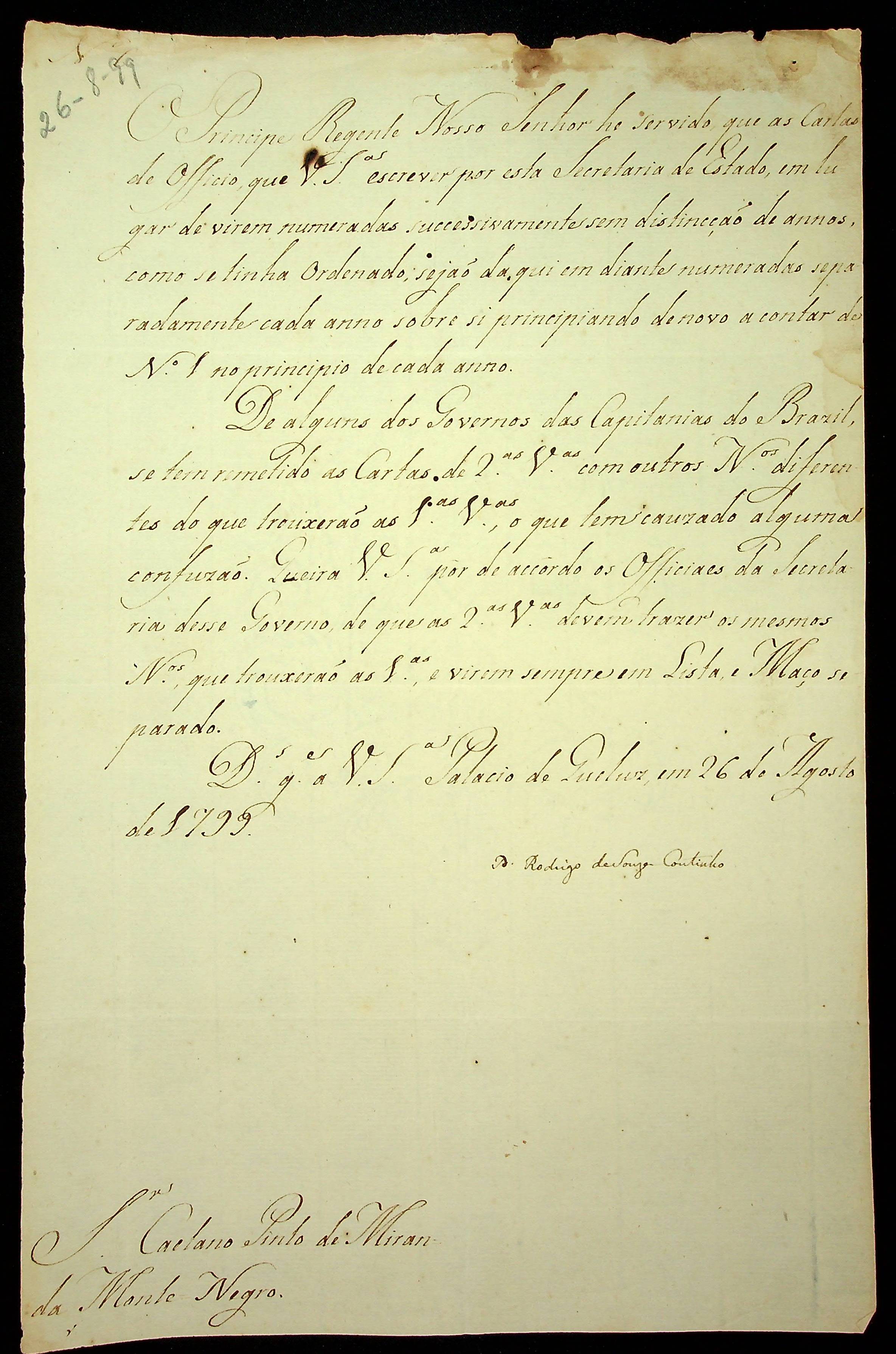 AVISO RÉGIO de D. Rodrigo de Souza Coutinho ao [Governador e Capitão General da Capitania de Mato Grosso] Caetano Pinto de Miranda e Montenegro.