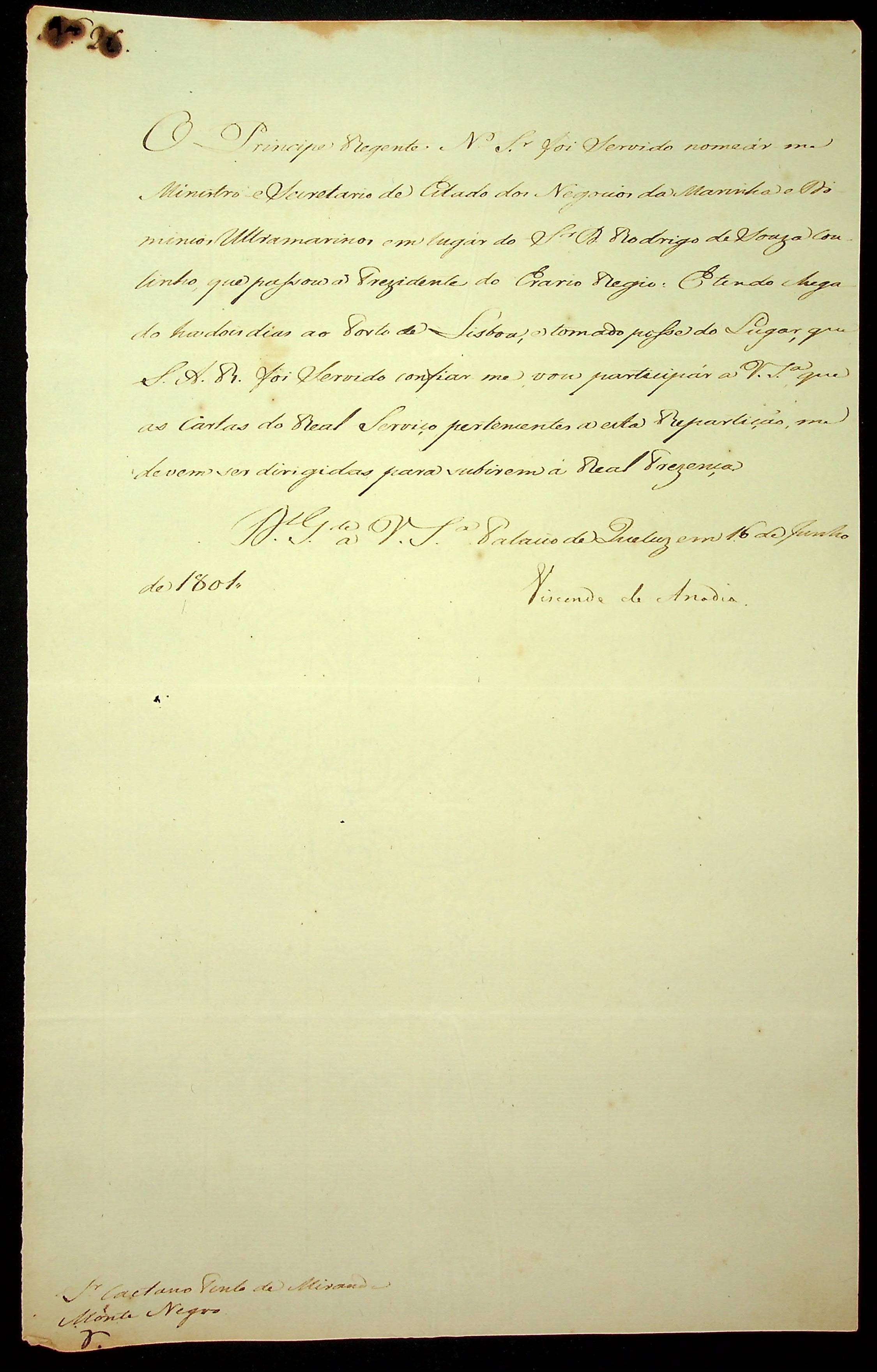 AVISO RÉGIO de Visconde de Anadia ao [Governador e Capitão General da Capitania de Mato Grosso] Caetano Pinto de Miranda e Montenegro.