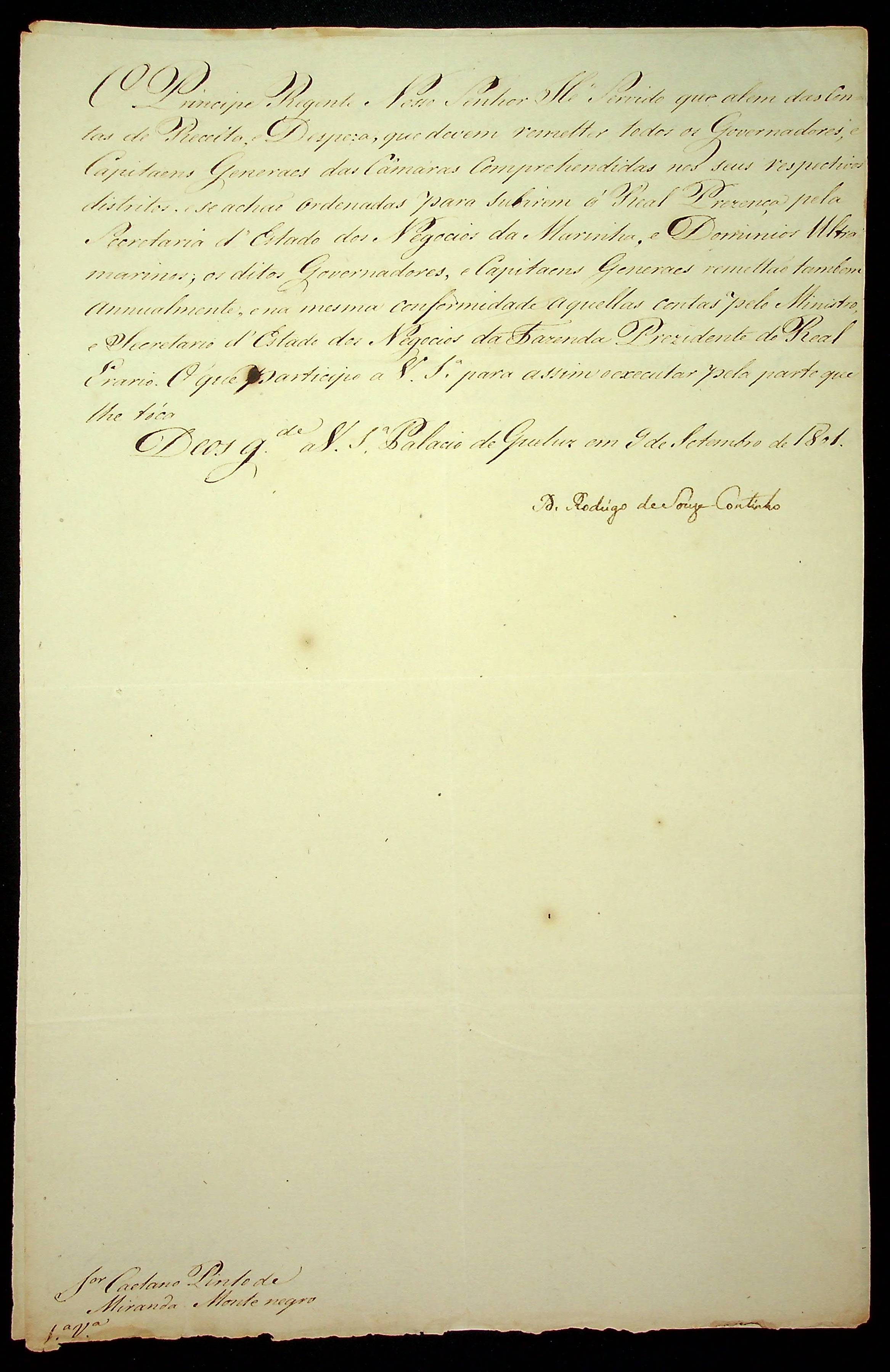 AVISO RÉGIO de D. Rodrigo de Souza Coutinho ao [Governador e Capitão General da Capitania de Mato Grosso] Caetano Pinto de Miranda e Montenegro.