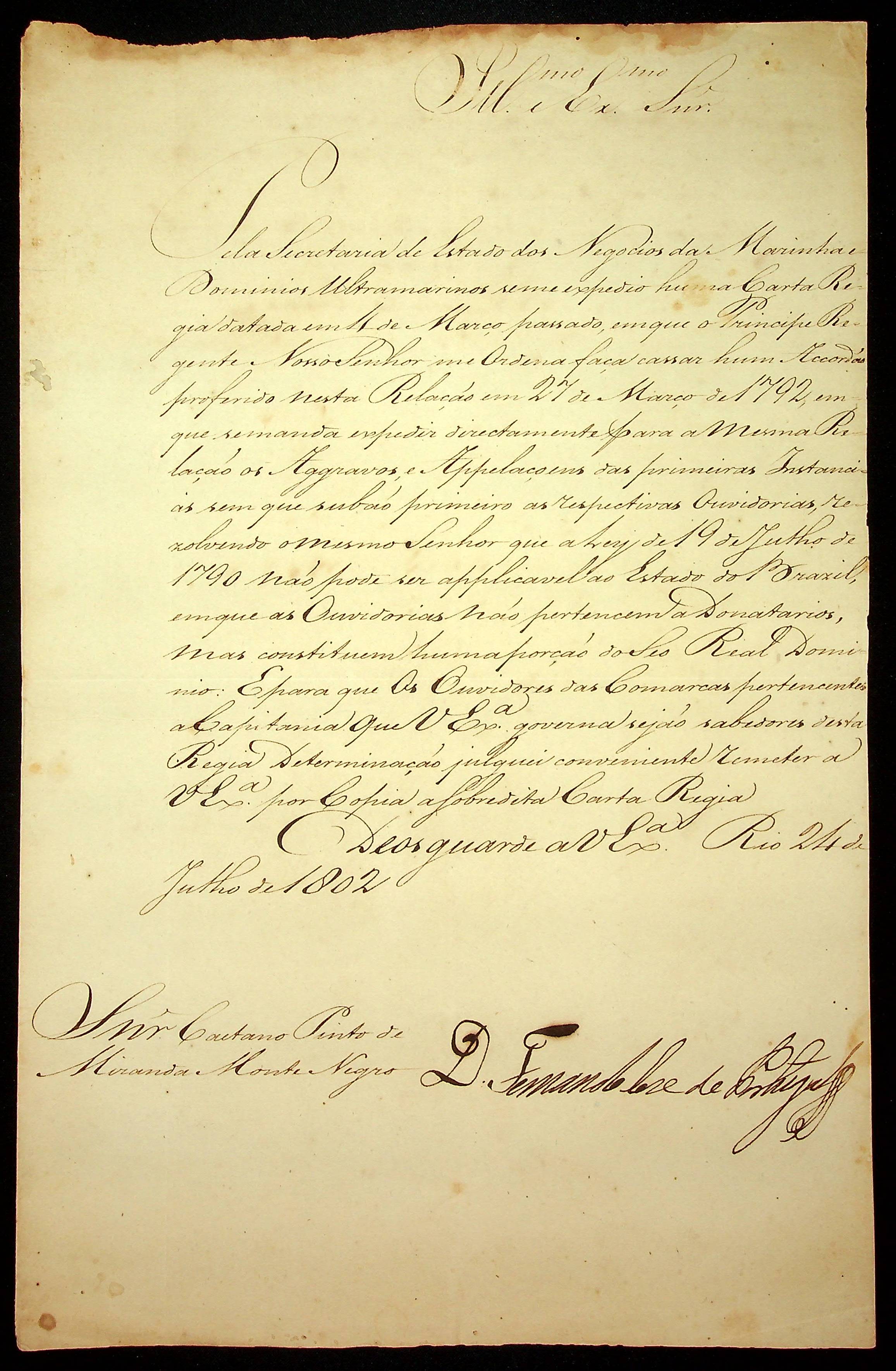 AVISO RÉGIO de D. Fernando de Portugual ao [Governador e Capitão General da Capitania de Mato Grosso] Caetano Pinto de Miranda e Montenegro.