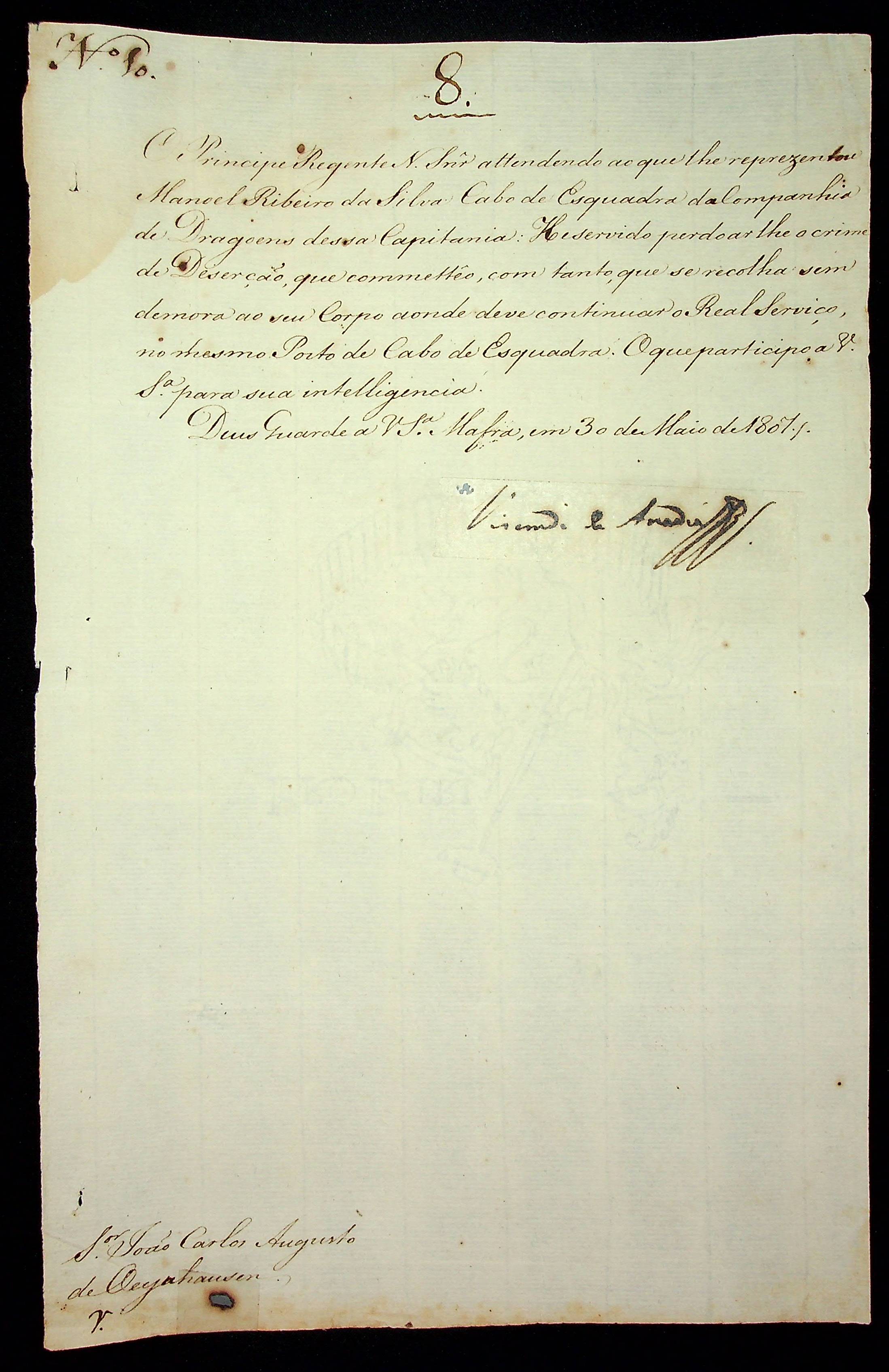 AVISO RÉGIO do Visconde de Anadia ao [Governador e Capitão-General da Capitania de Mato Grosso] João Carlos Augusto D’Oeynhausen e Gravemberg.