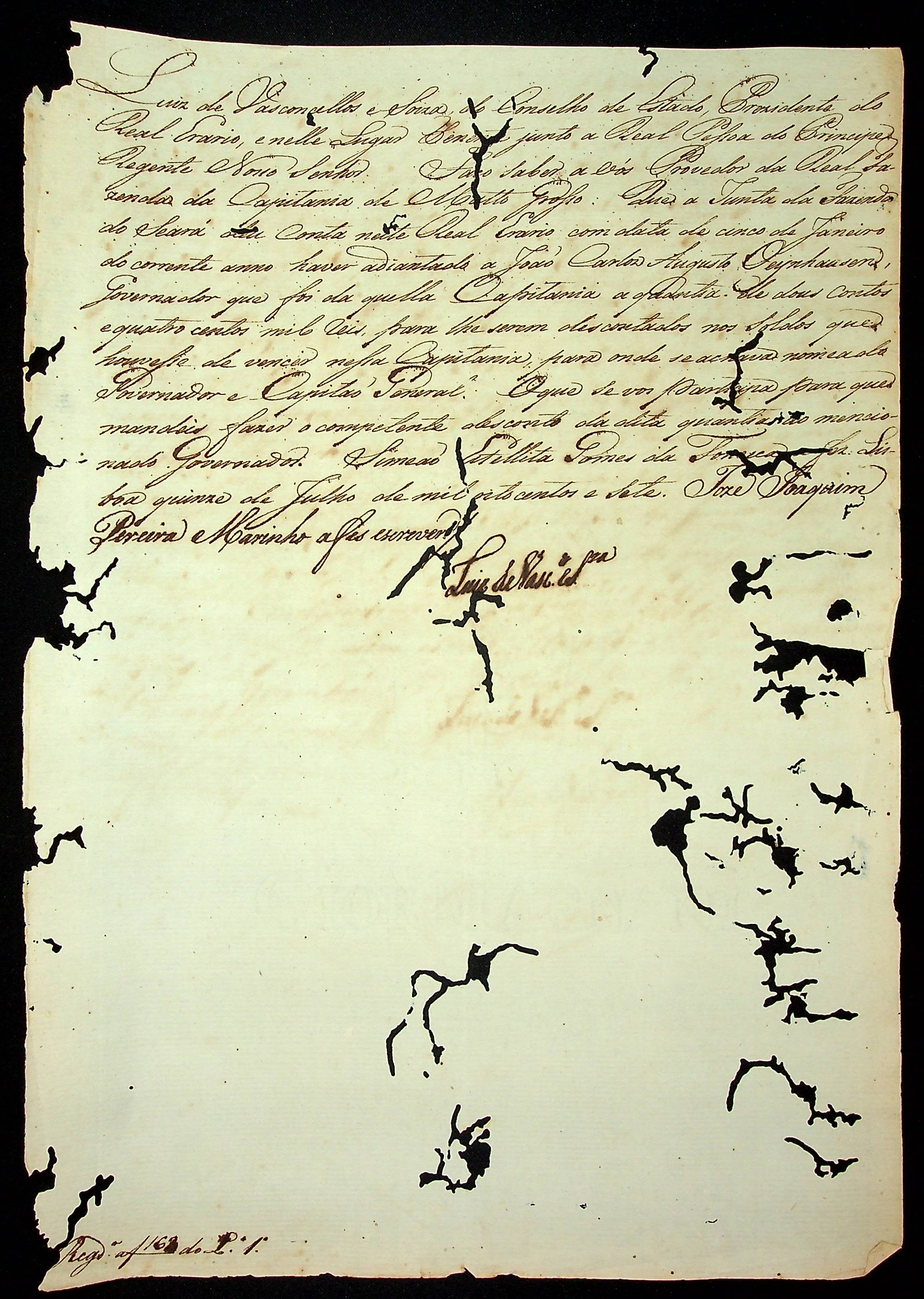 AVISO RÉGIO do Presidente do Real Erario Luiz de Vasconcelos e Souza ao Provedor da Real Fazenda da Capitania de Mato Grosso.