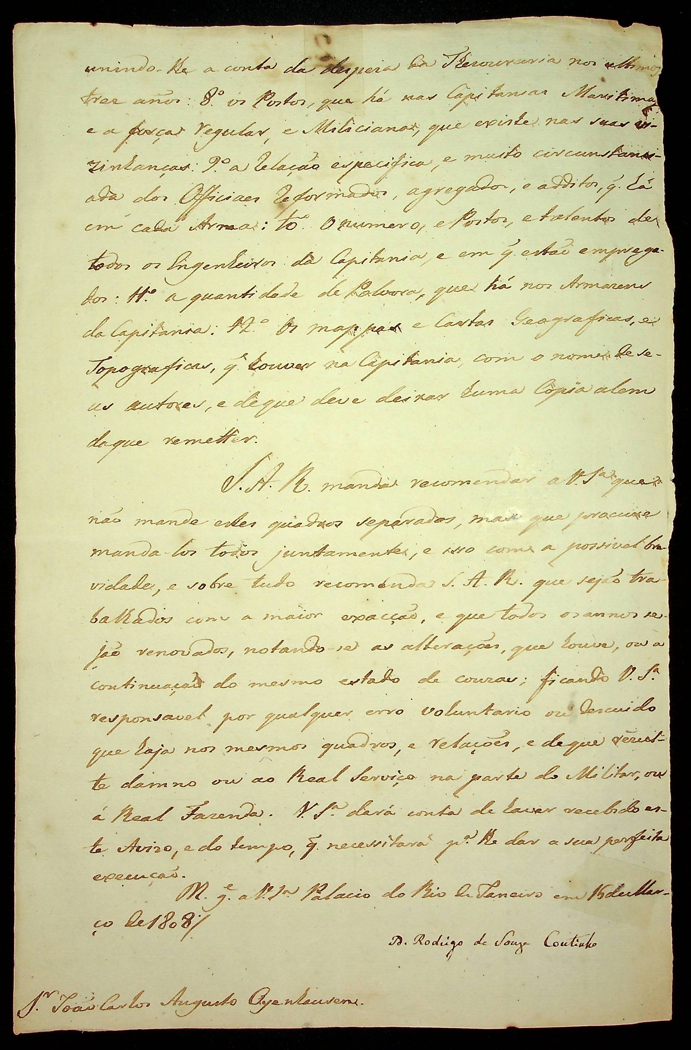AVISO RÉGIO de Rodrigo Souza Coutinho ao [Governador e Capitão-General da Capitania de Mato Grosso] João Carlos Augusto D’Oeynhausen e Gravemberg.