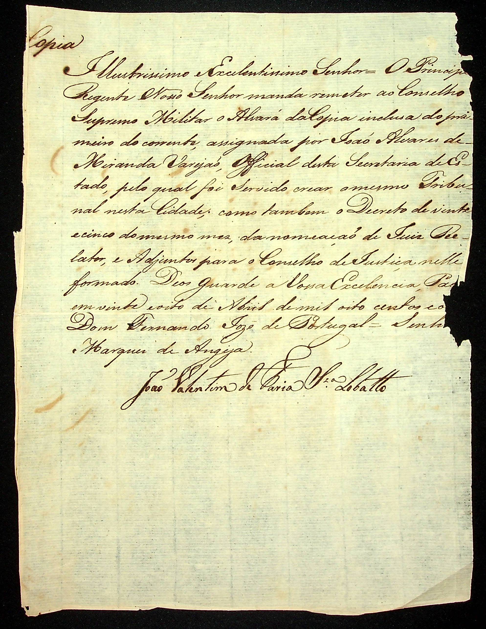 AVISO RÉGIO (cópia) do [Ministro e Secretário de Estado dos Negócios Estrangeiros e da Guerra] Fernando José de Portugal ao Marques de Angya.
