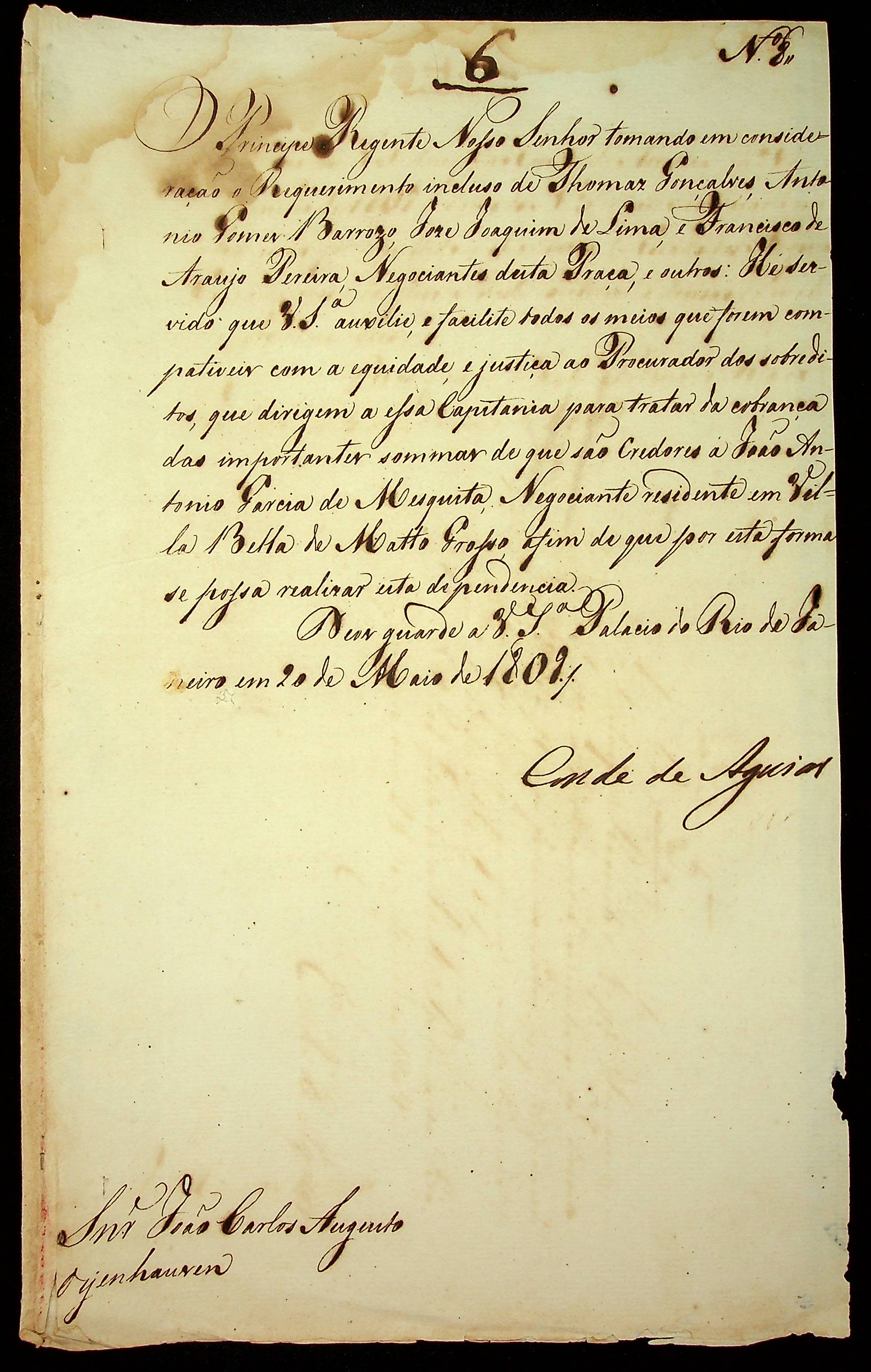 AVISO RÉGIO do Conde de Aguiar ao [Governador e Capitão-General da Capitania de Mato Grosso] João Carlos Augusto D’Oeynhausen e Gravemberg.