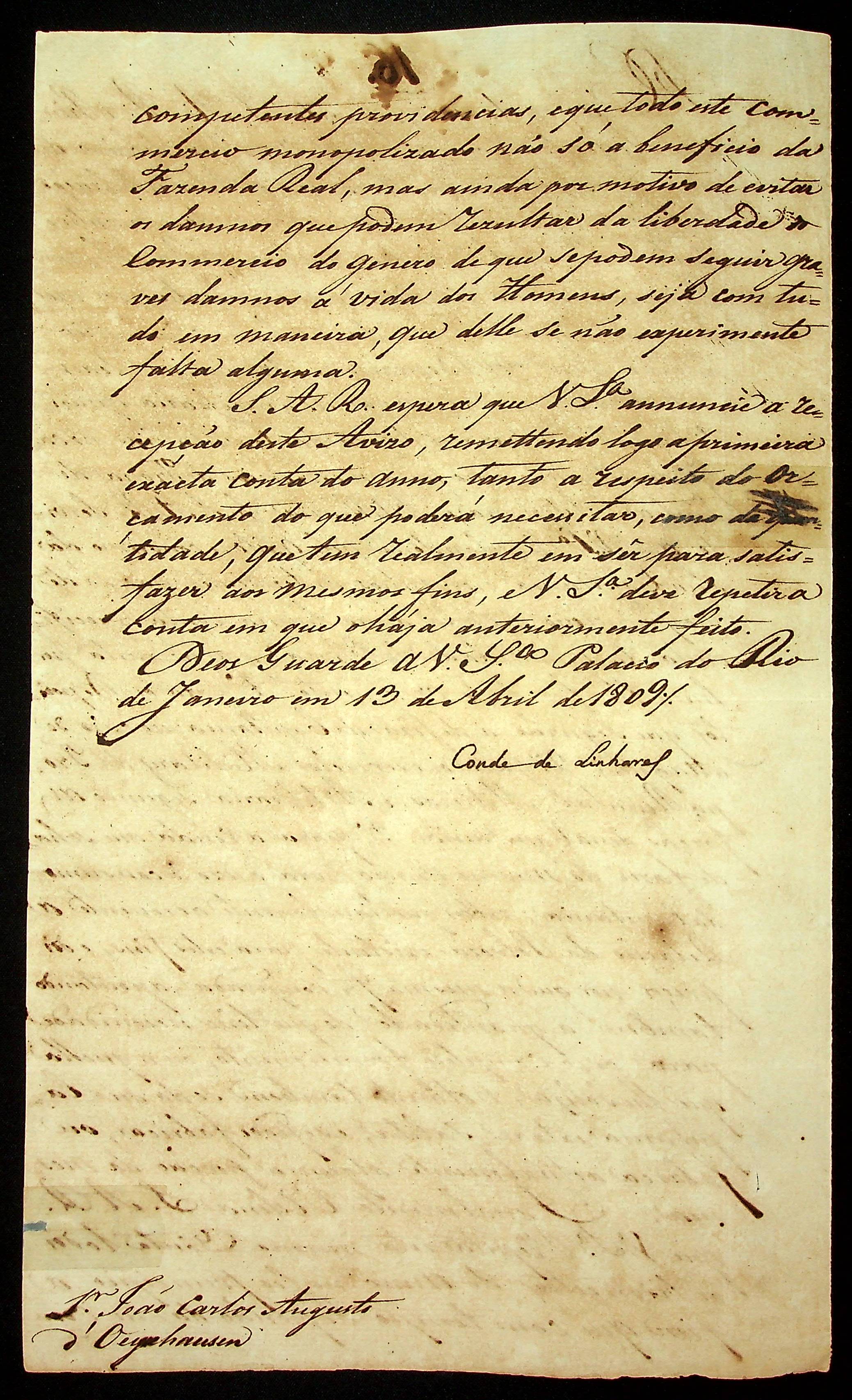 AVISO RÉGIO do Conde de Linhares ao [Governador e Capitão-General da Capitania de Mato Grosso] João Carlos Augusto D’Oeynhausen e Gravemberg.