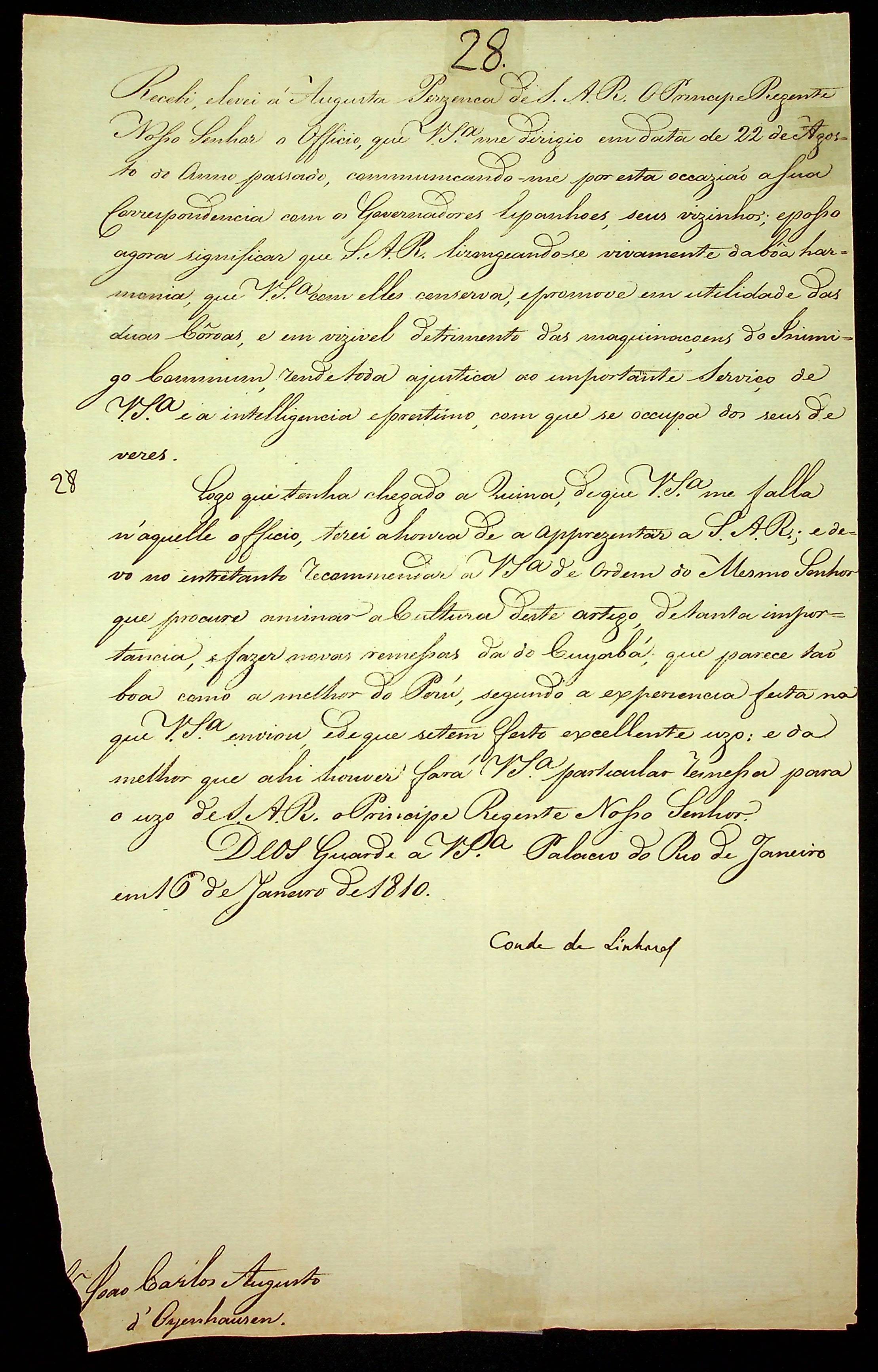 AVISO RÉGIO do Conde de Linhares ao [Governador e Capitão-General da Capitania de Mato Grosso] João Carlos Augusto D’Oeynhausen e Gravemberg.