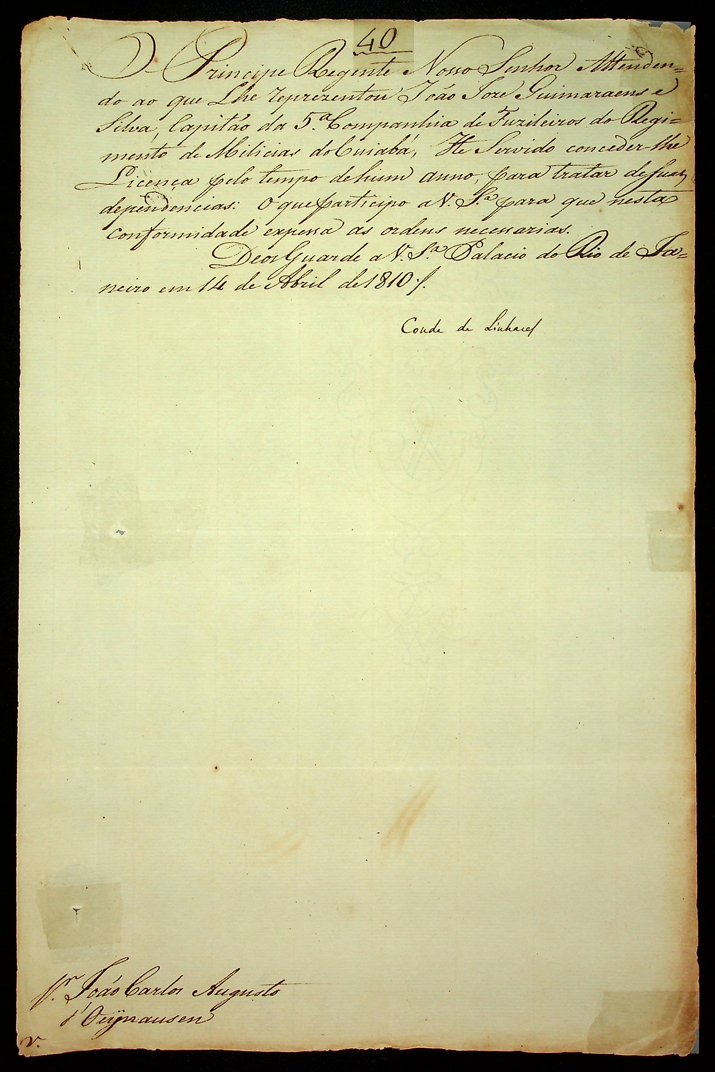 AVISO RÉGIO do Conde de Linhares ao [Governador e Capitão-General da Capitania de Mato Grosso] João Carlos Augusto D’Oeynhausen e Gravemberg.