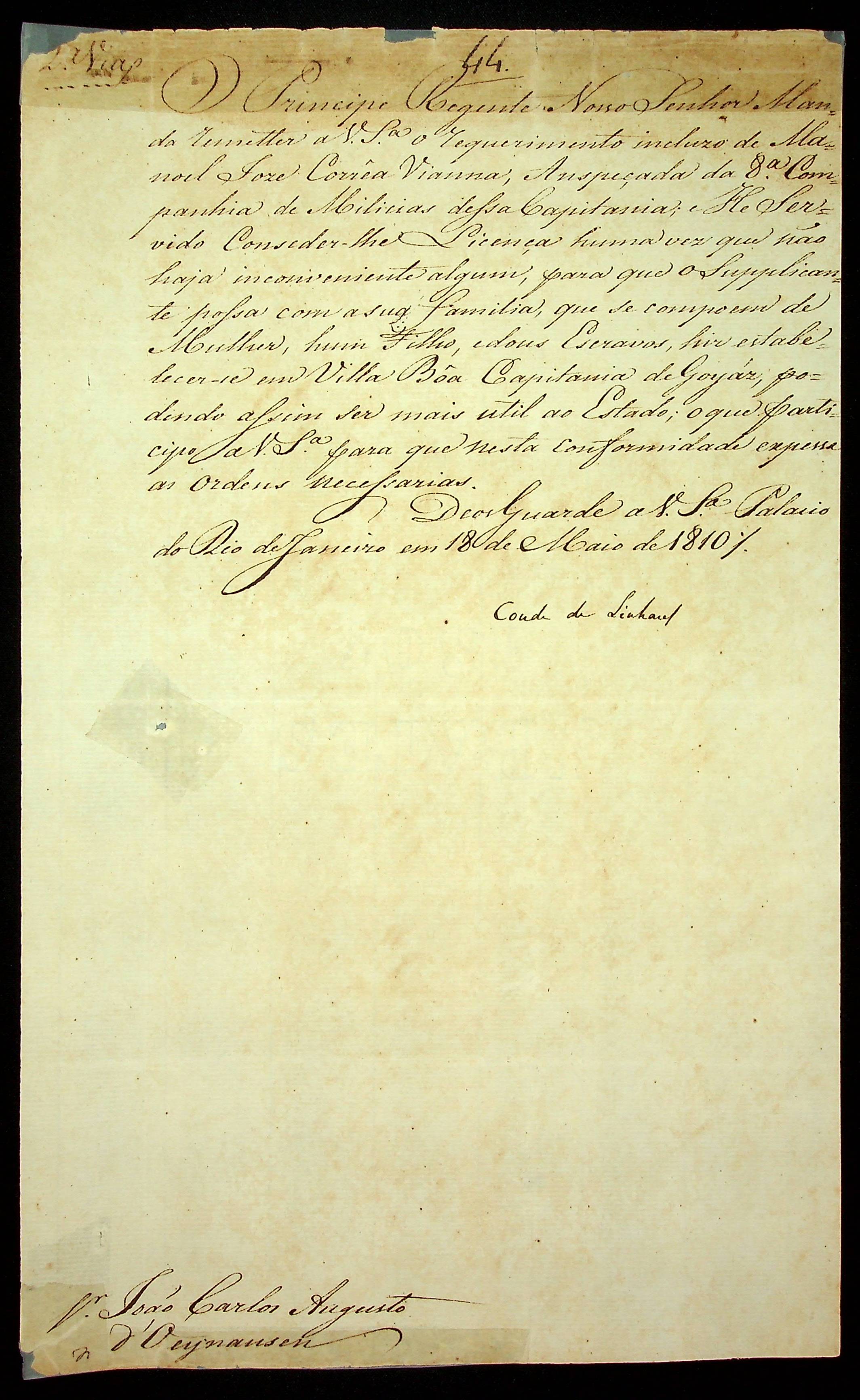 AVISO RÉGIO do Conde de Linhares ao [Governador e Capitão-General da Capitania de Mato Grosso] João Carlos Augusto D’Oeynhausen e Gravemberg.