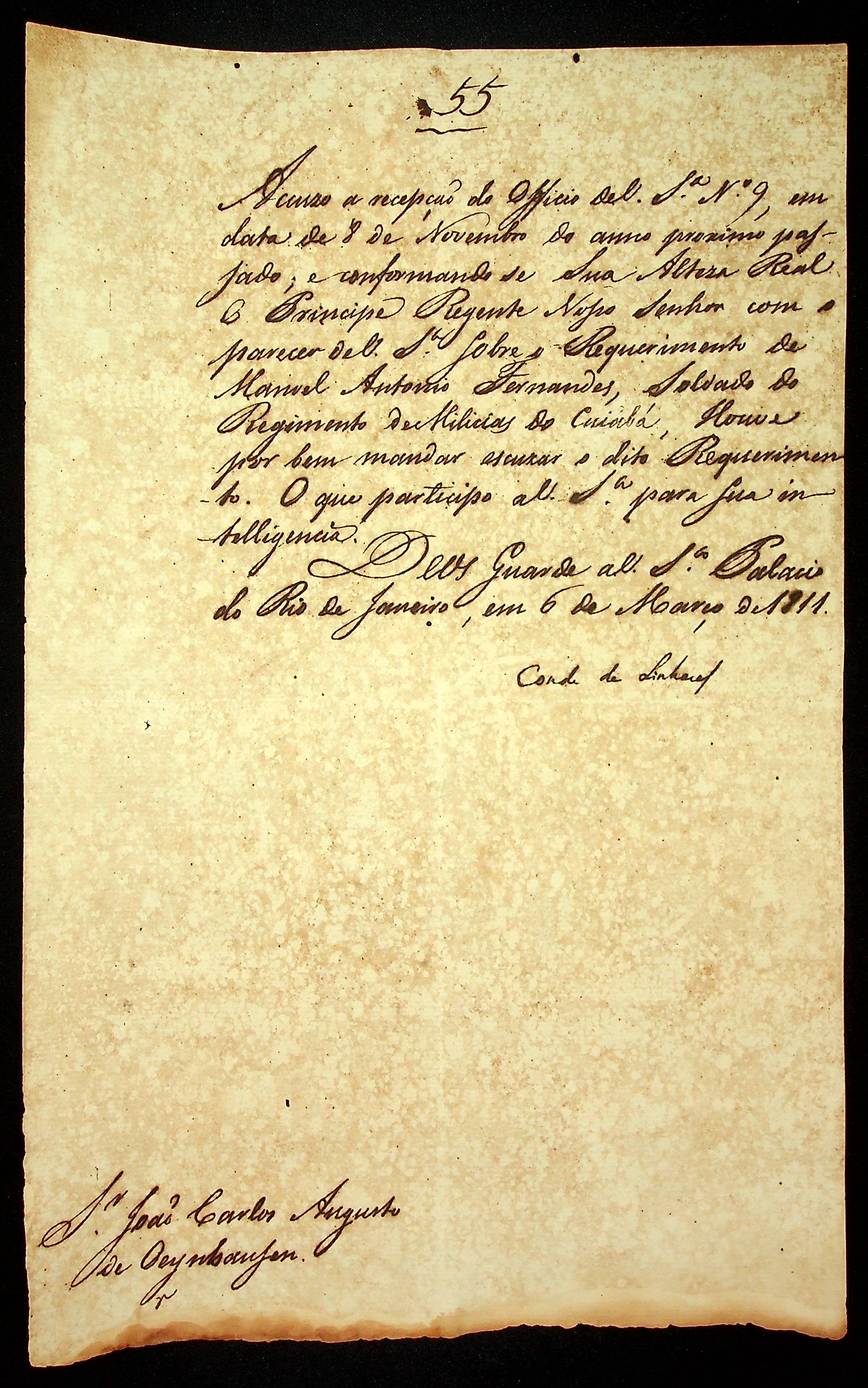 AVISO RÉGIO do Conde de Linhares ao [Governador e Capitão-General da Capitania de Mato Grosso] João Carlos Augusto D’Oeynhausen e Gravemberg.