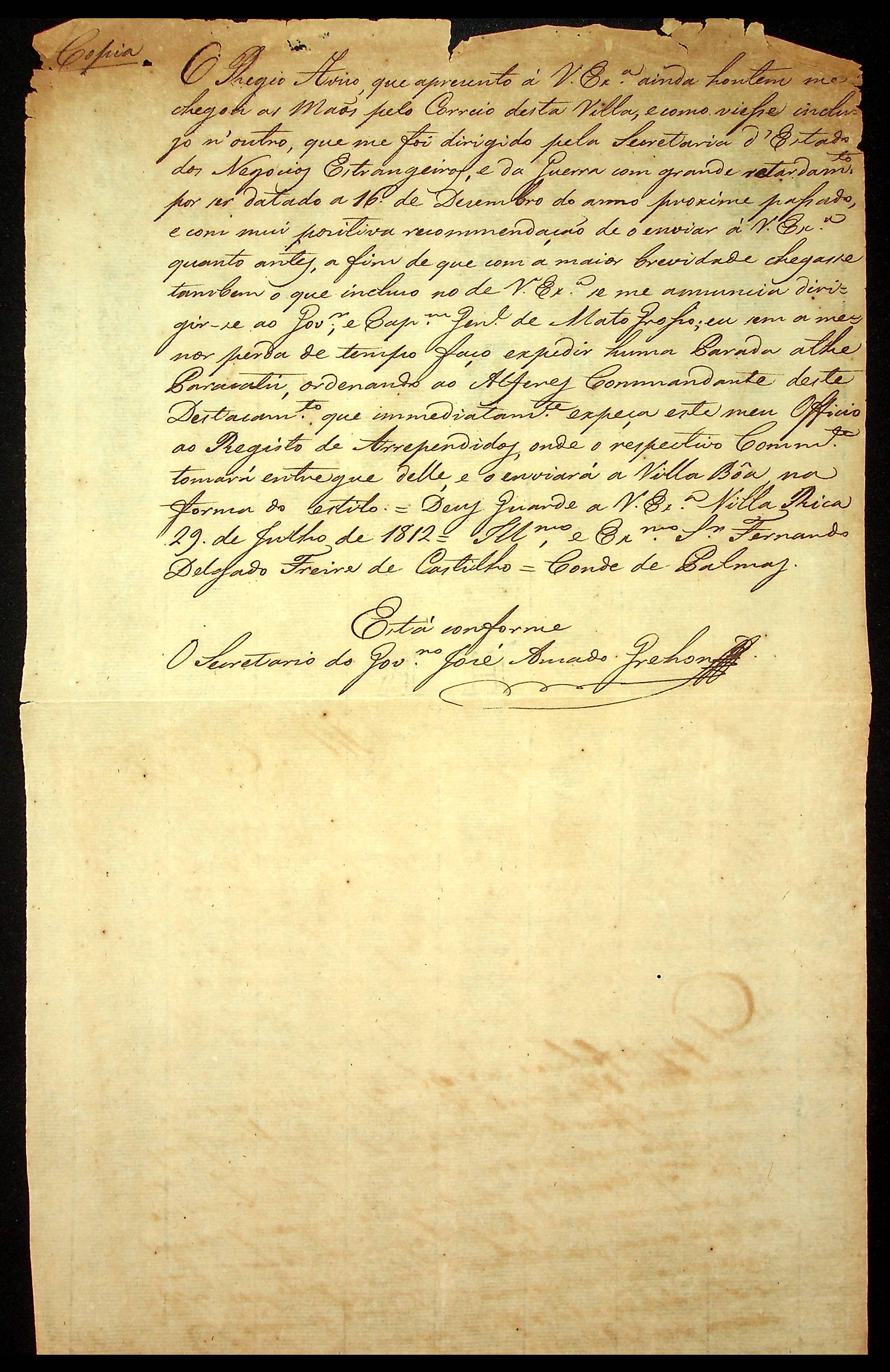 AVISO RÉGIO (copia) do Conde de Palmas à Fernando Delgado Freire de Castilho.