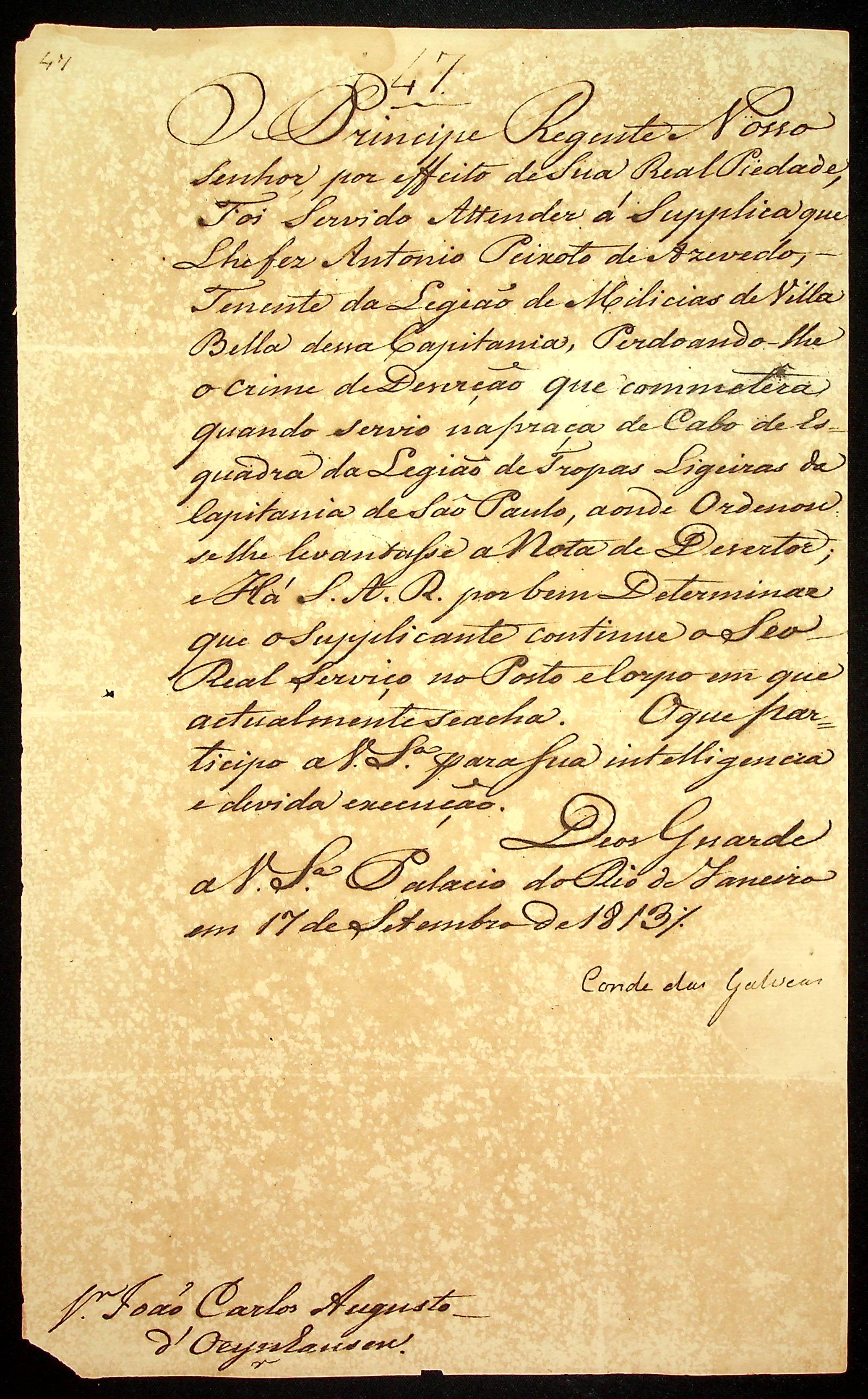 AVISO RÉGIO do Conde das Galveas ao [Governador e Capitão-General da Capitania de Mato Grosso] João Carlos Augusto D’Oeynhausen e Gravemberg.