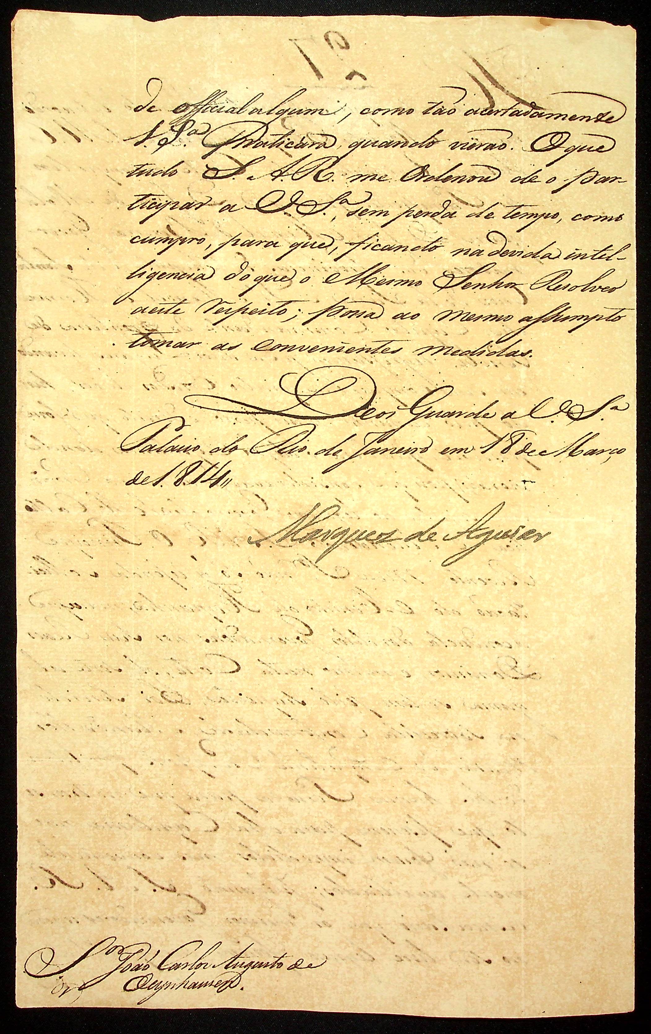 AVISO RÉGIO do Marques de Aguiar ao [Governador e Capitão-General da Capitania de Mato Grosso] João Carlos Augusto D’Oeynhausen e Gravemberg.