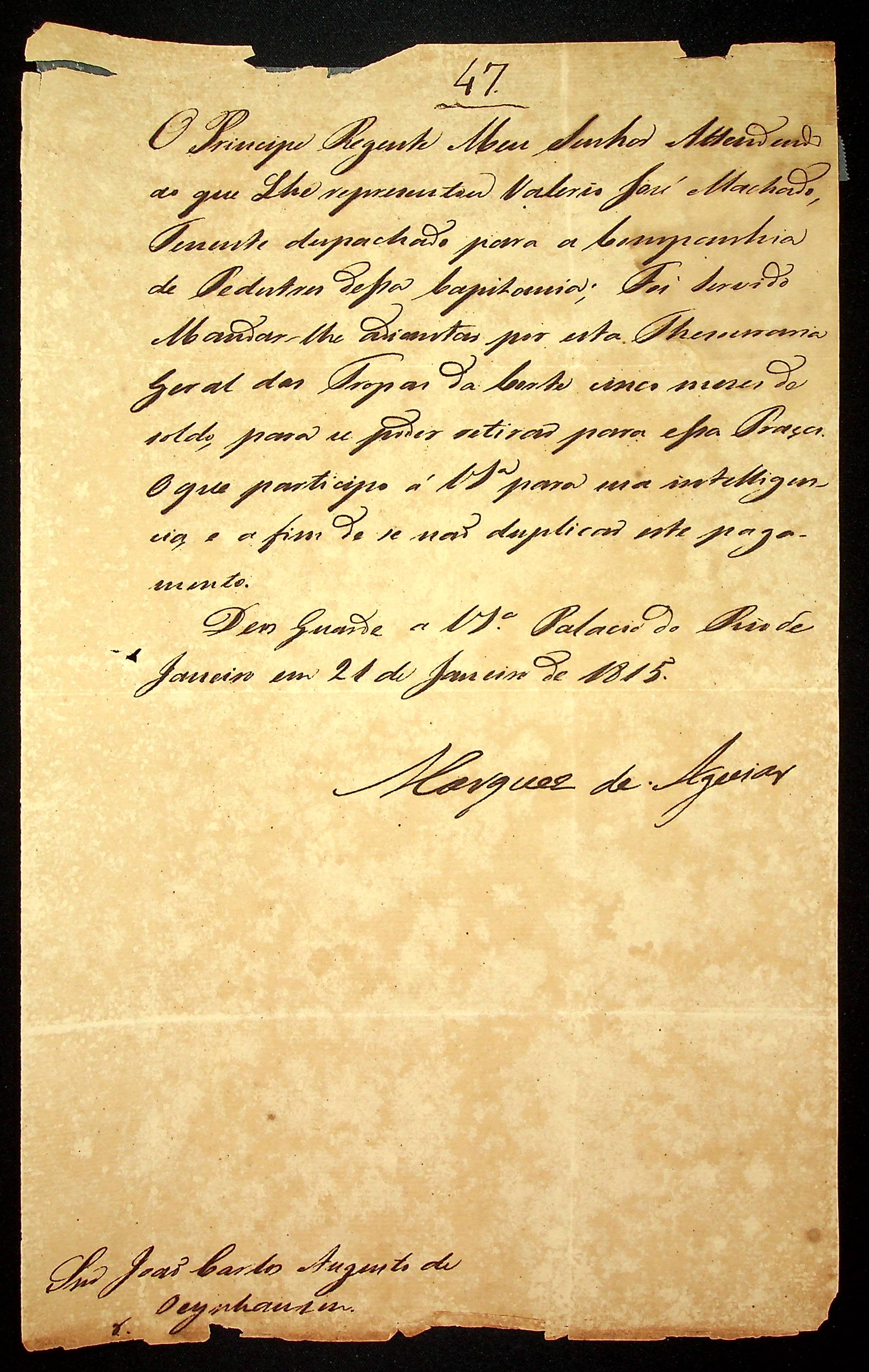 AVISO RÉGIO do Marques de Aguiar ao [Governador e Capitão-General da Capitania de Mato Grosso] João Carlos Augusto D’Oeynhausen e Gravemberg.