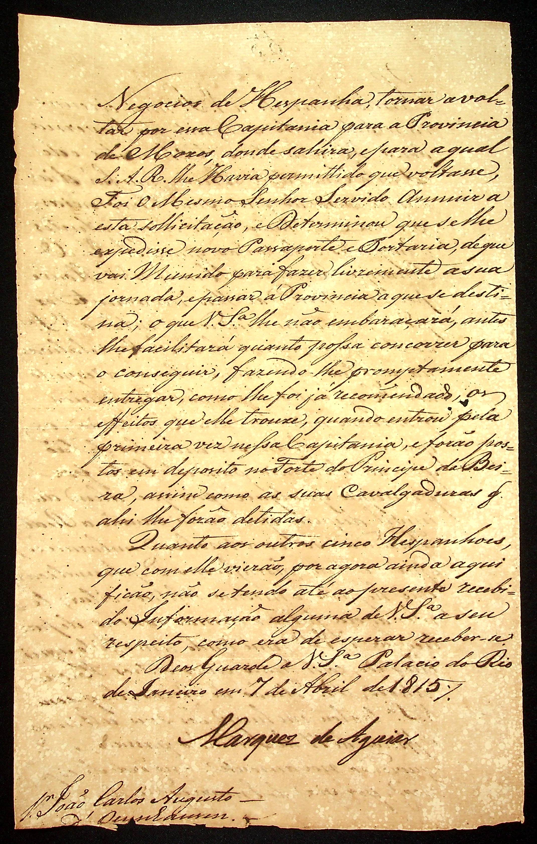 AVISO RÉGIO do Marques de Aguiar ao [Governador e Capitão-General da Capitania de Mato Grosso] João Carlos Augusto D’Oeynhausen e Gravemberg.