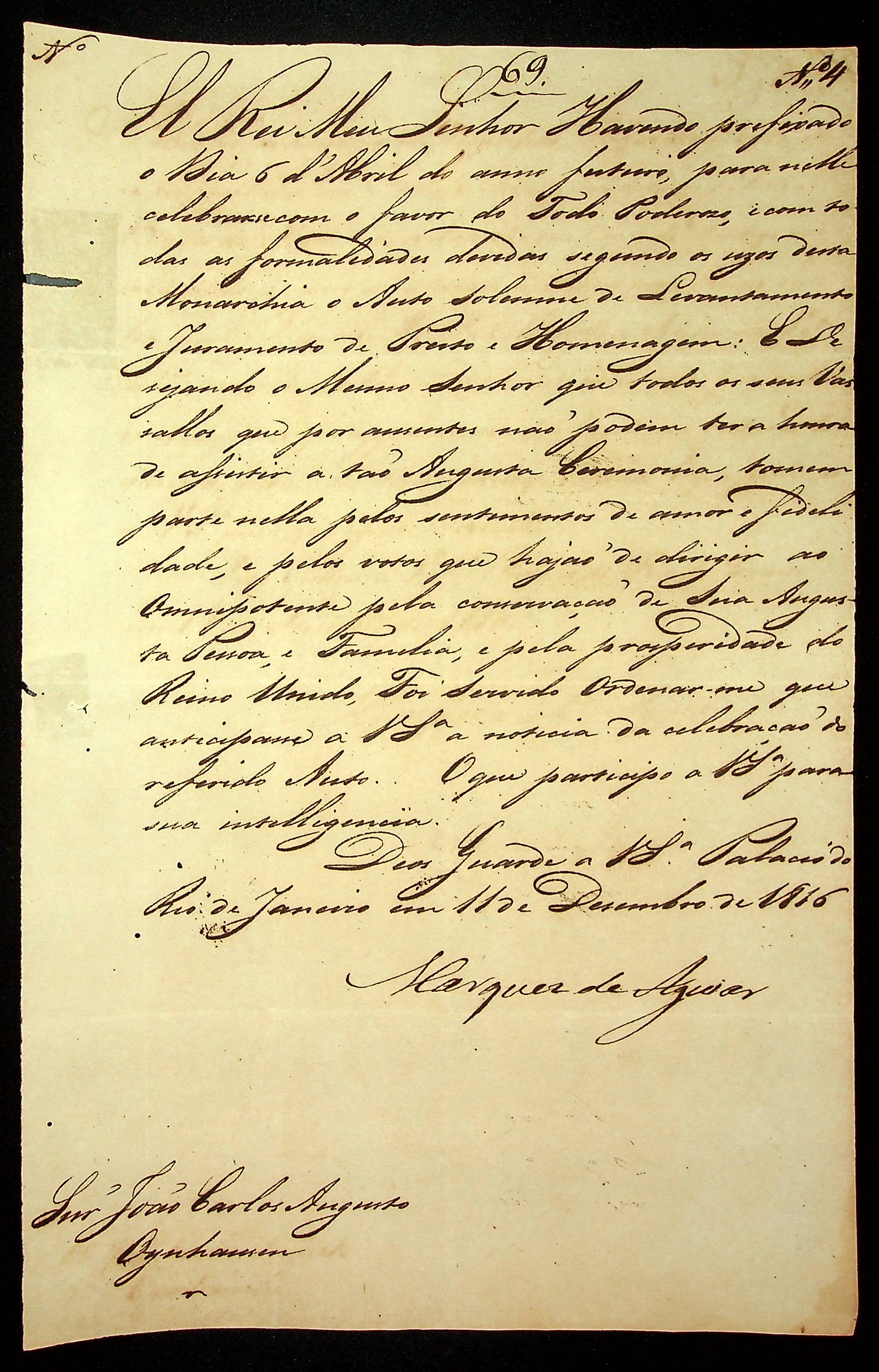 AVISO RÉGIO do Marques de Aguiar ao [Governador e Capitão-General da Capitania de Mato Grosso] João Carlos Augusto D’Oeynhausen e Gravemberg.