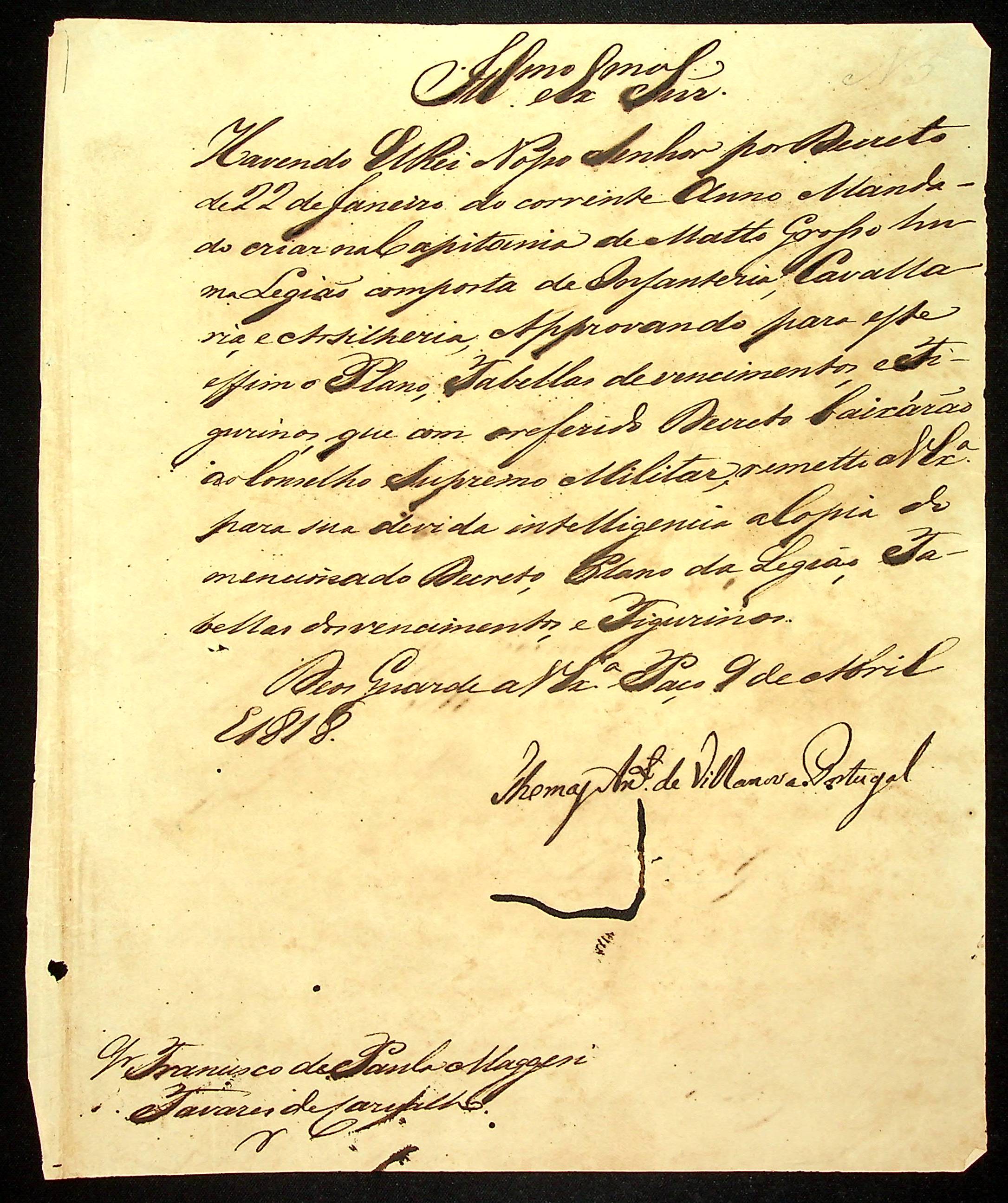 AVISO RÉGIO de Thomas Antônio de Vilanova Portugal ao [Governador e Capitão General da Capitania de Mato Grosso] Francisco de Paula Magessi Tavares de Carvalho.