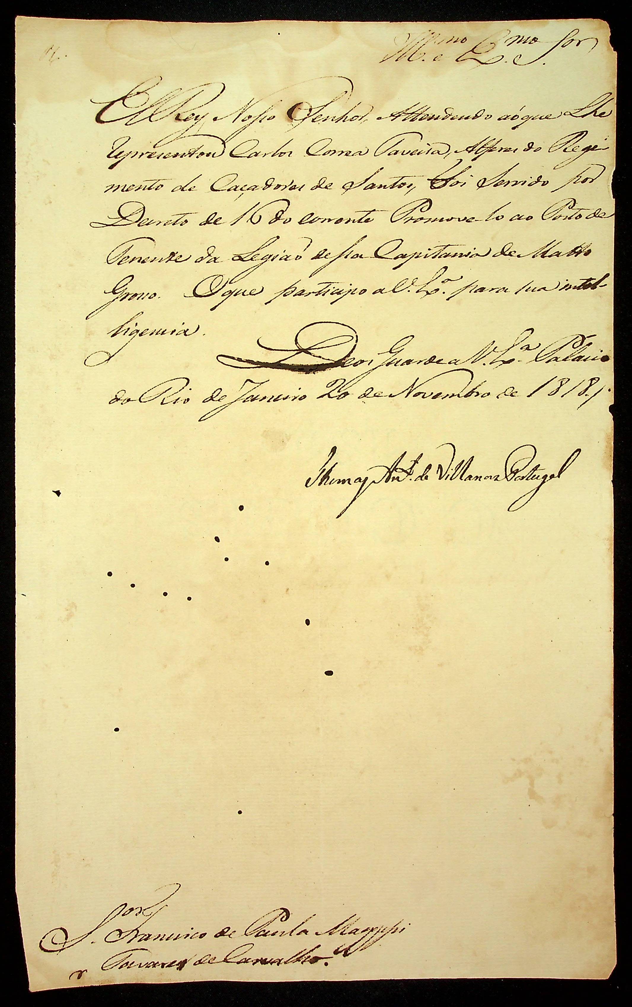 AVISO RÉGIO de Thomas Antônio de Villanova Portugal ao [Governador e Capitão General da Capitania de Mato Grosso] Francisco de Paula Magessi Tavares de Carvalho.