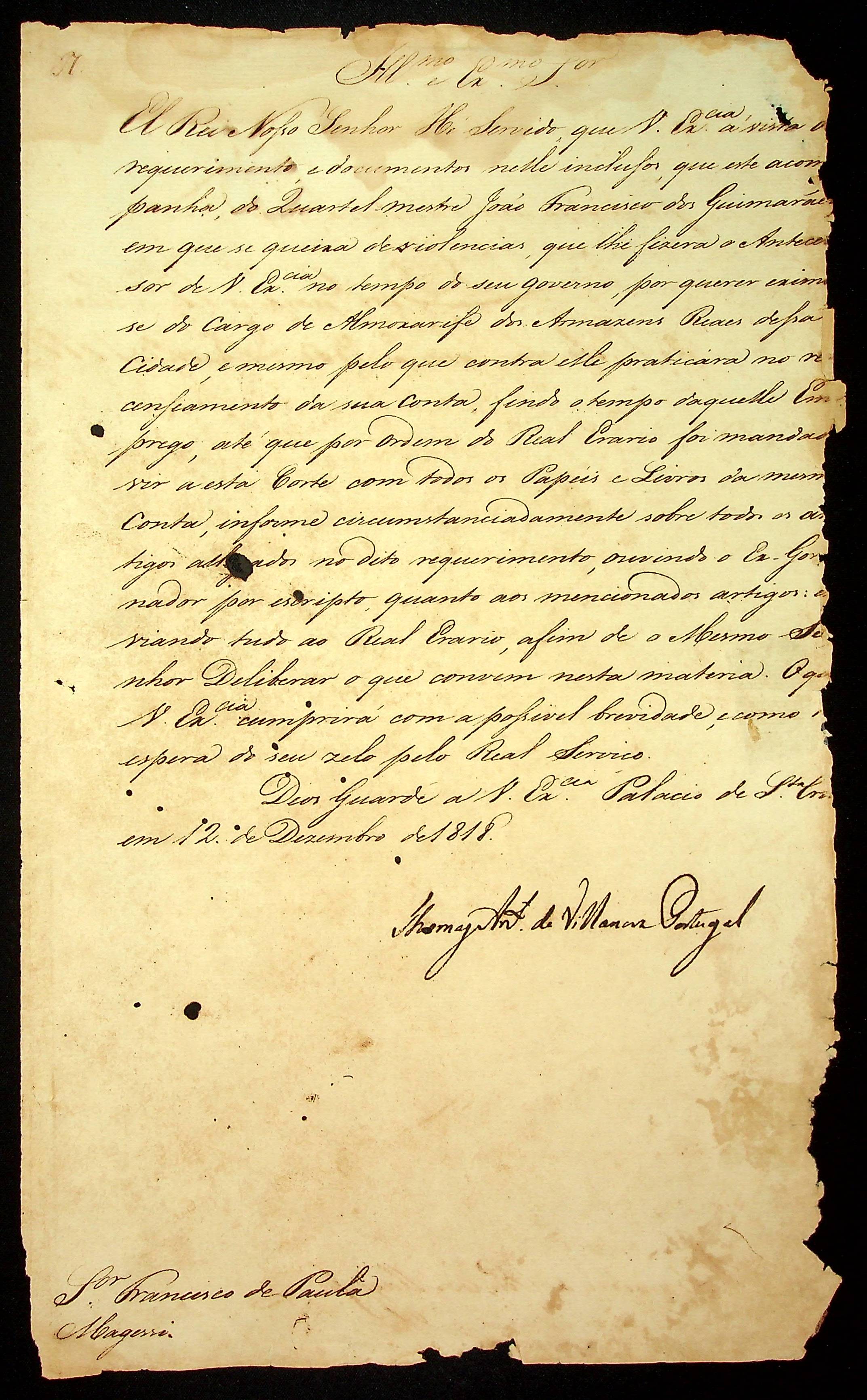 AVISO RÉGIO de Thomas Antônio de Villanova Portugal ao [Governador e Capitão General da Capitania de Mato Grosso] Francisco de Paula Magessi Tavares de Carvalho.
