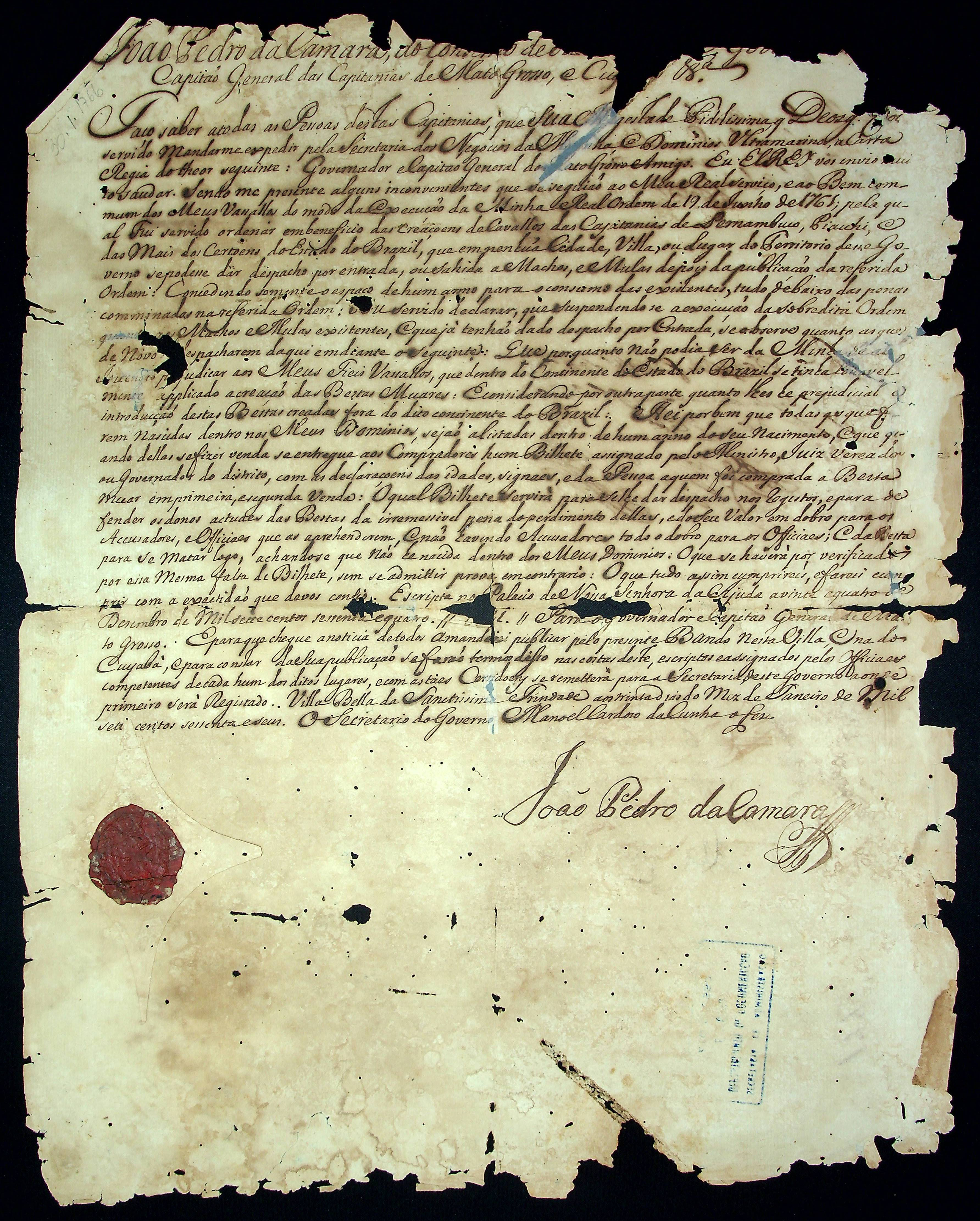 BANDO do Governador e Capitão General da Capitania de Mato Grosso João Pedro da Câmara.