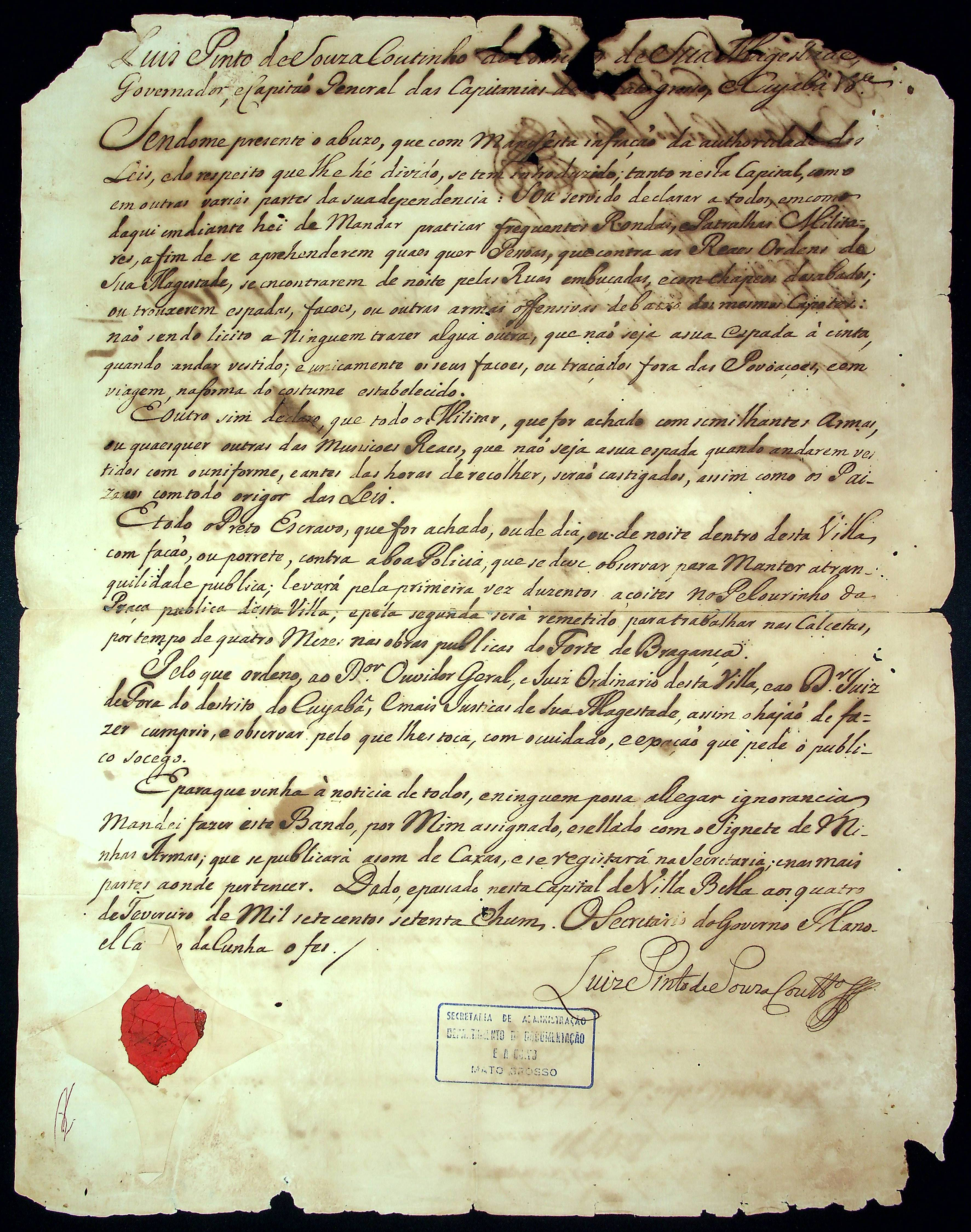 BANDO do Governador e Capitão General da Capitania de Mato Grosso Luís Pinto de Souza Coutinho.