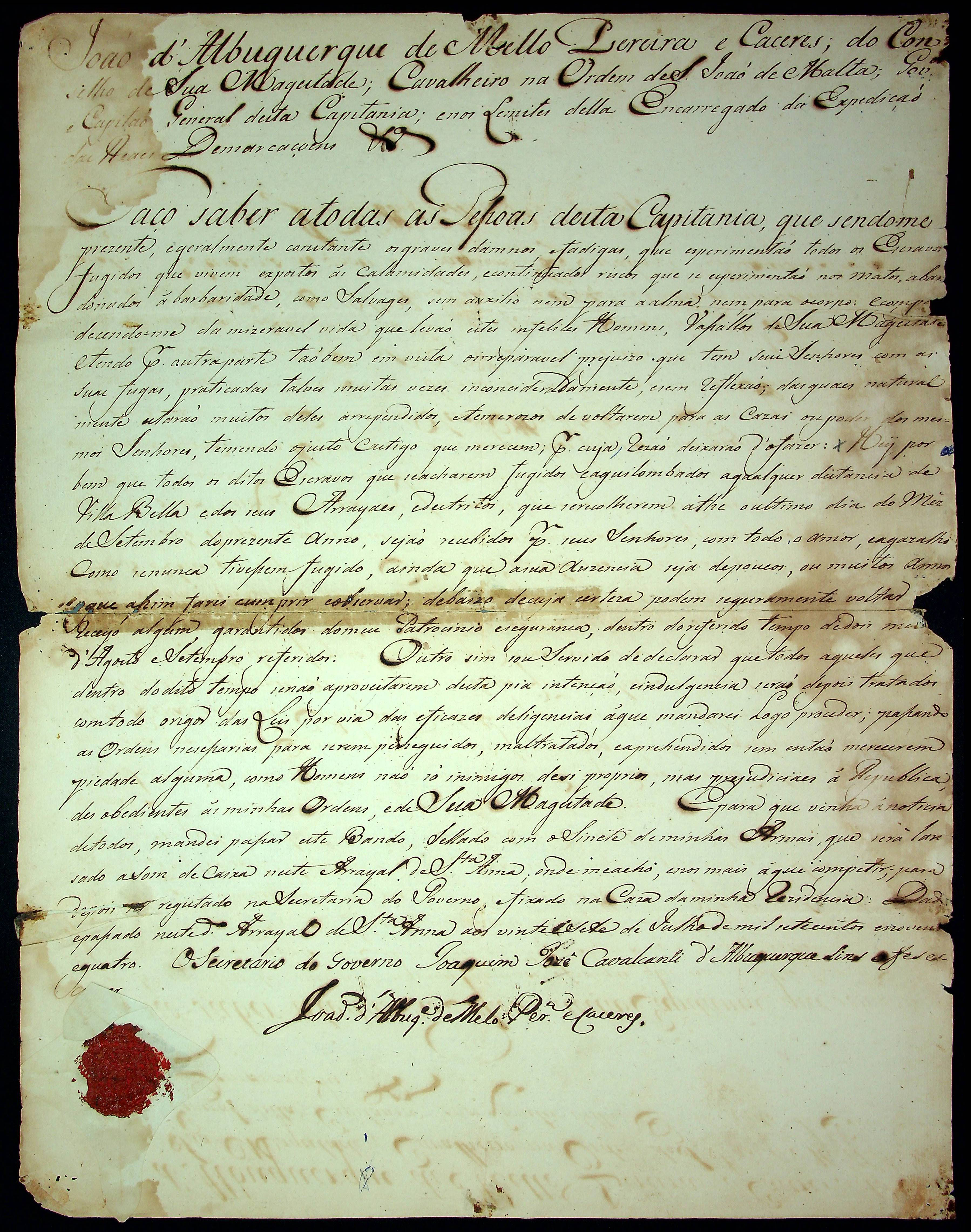 BANDO do Governador e Capitão General da Capitania de Mato Grosso João de Albuquerque de Melo Pereira e Cáceres.