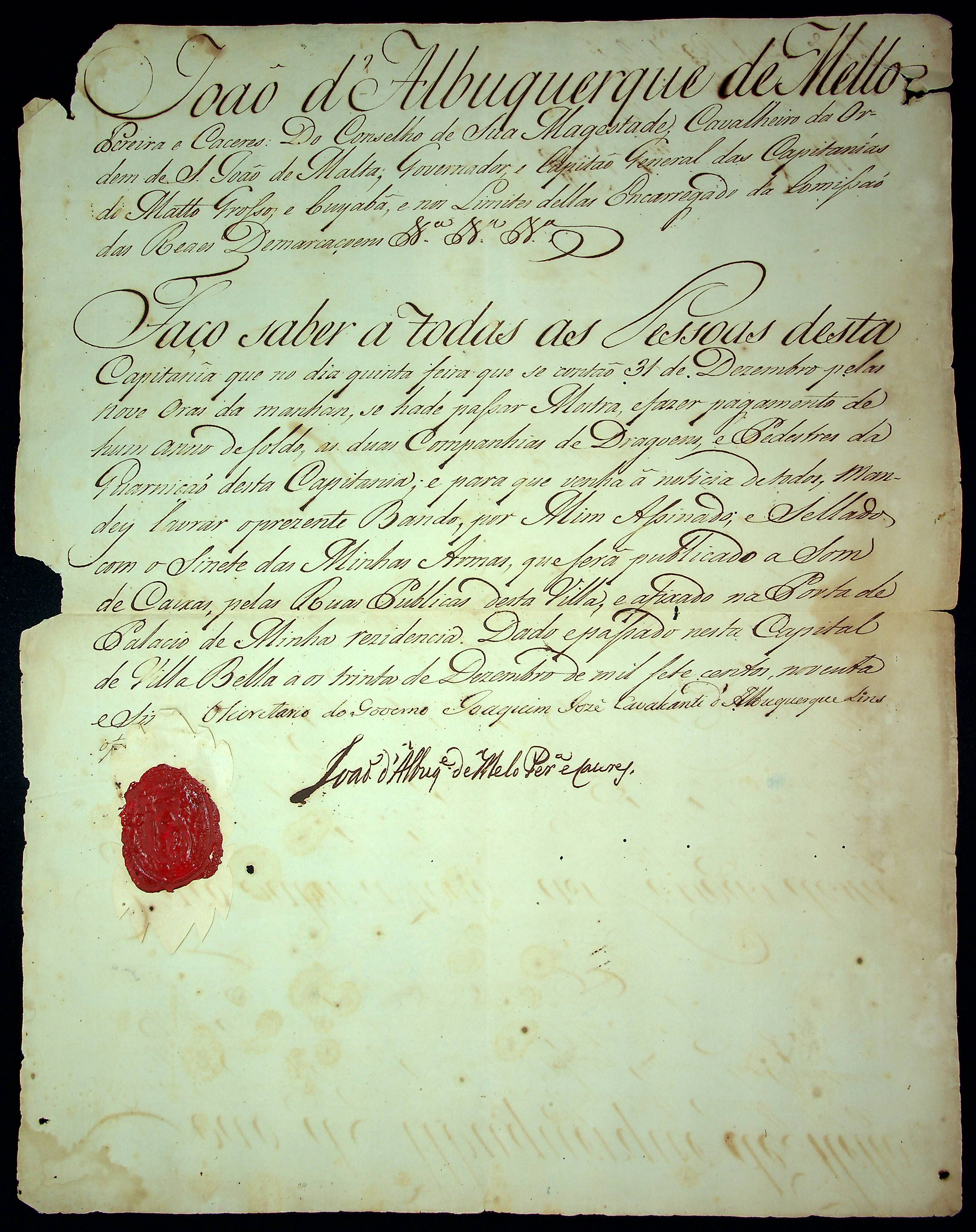 BANDO do Governador e Capitão General da Capitania de Mato Grosso João de Albuquerque de Melo Pereira e Cáceres.
