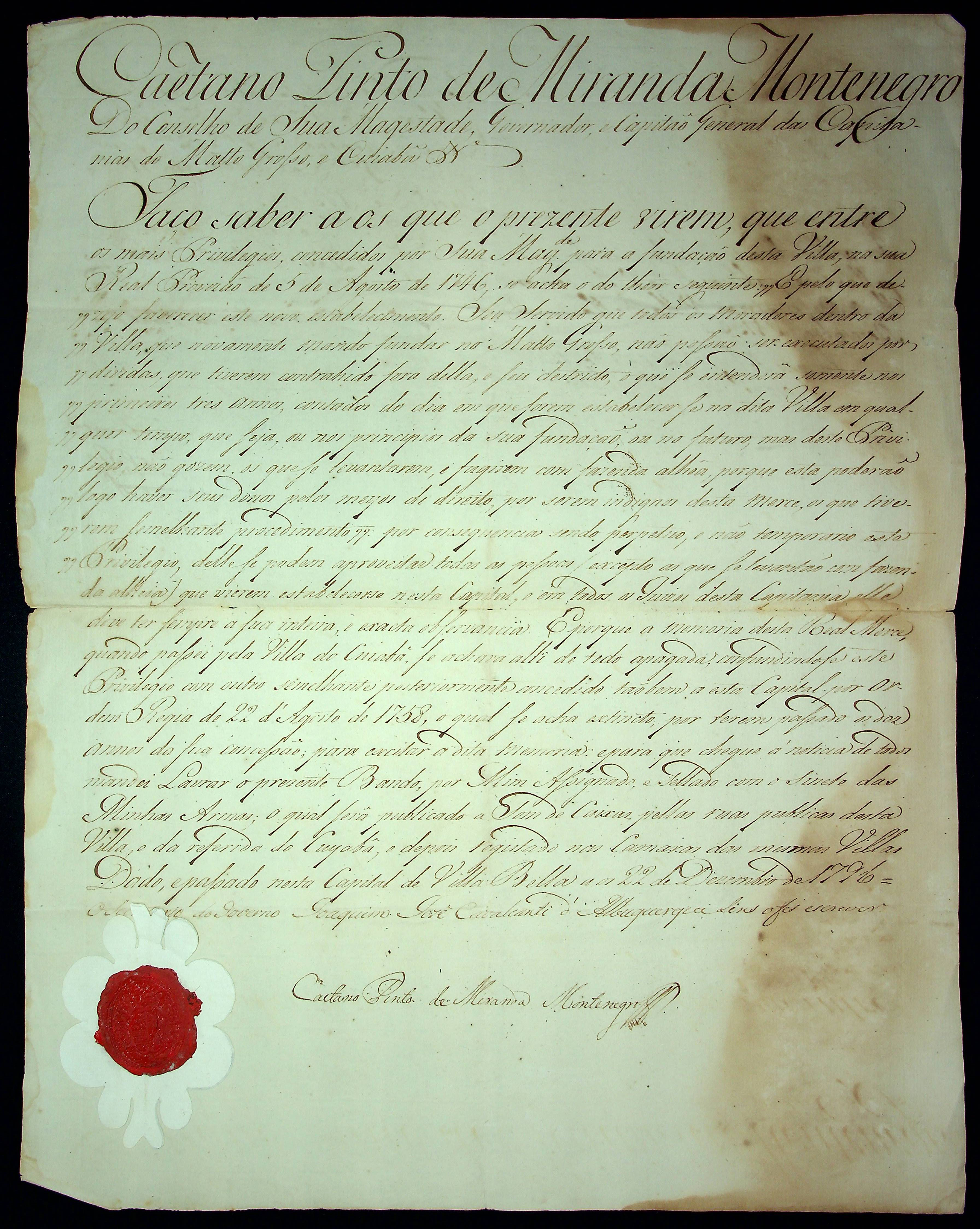 BANDO do Governador e Capitão General da Capitania de Mato Grosso Caetano Pinto de Miranda e Montenegro.