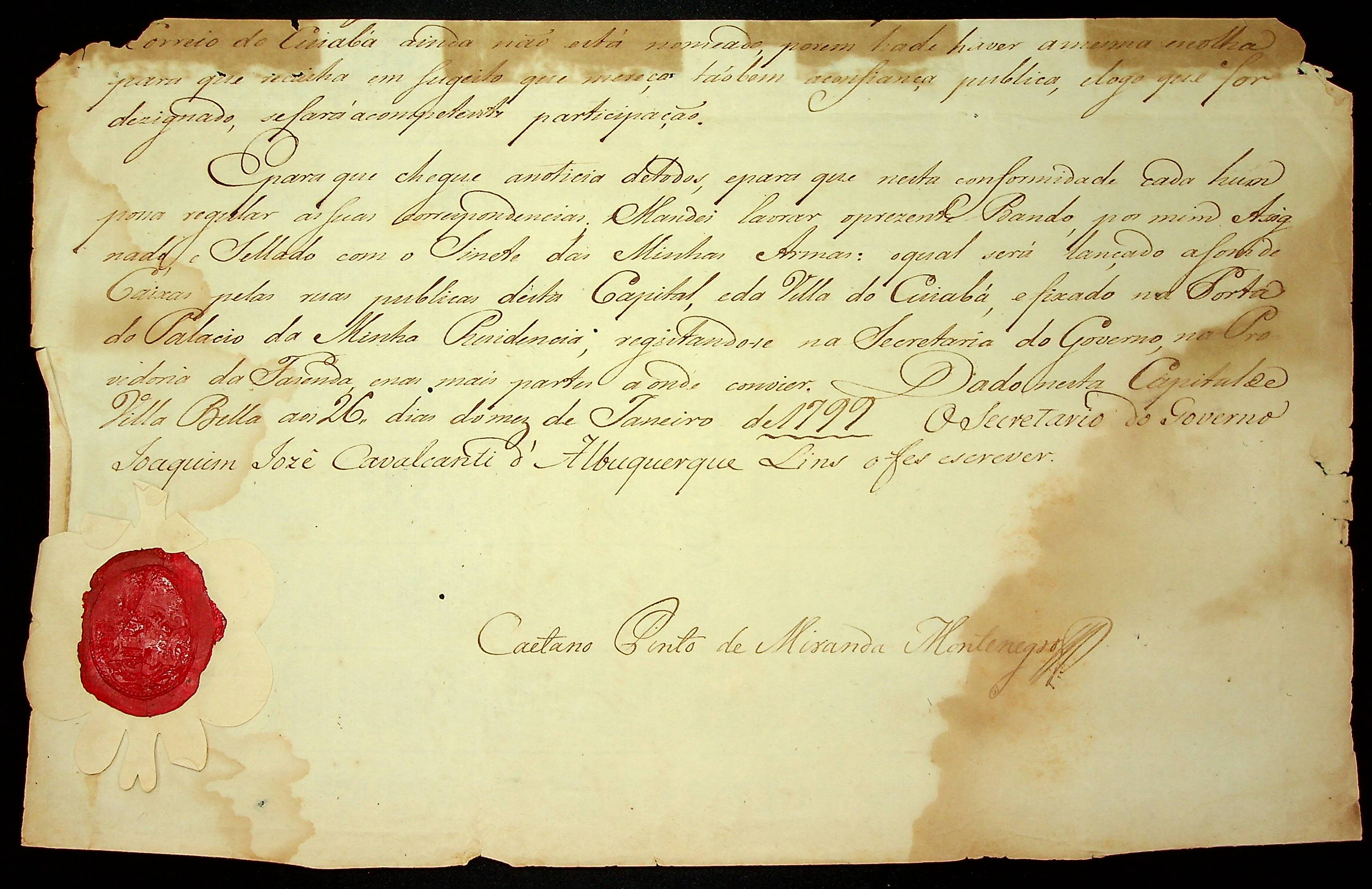 BANDO (incompleto) do Governador e Capitão General da Capitania de Mato Grosso Caetano Pinto de Miranda e Montenegro.