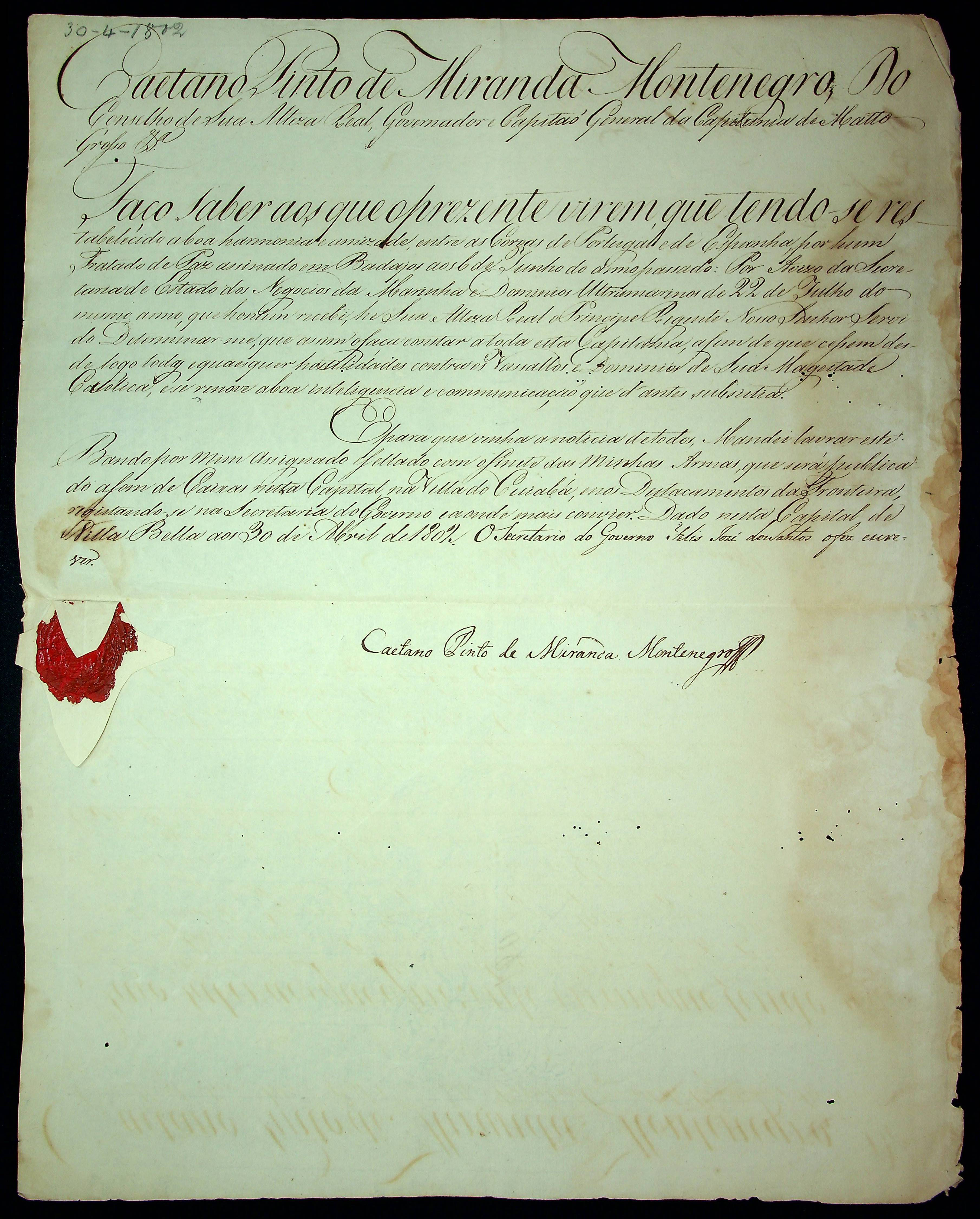 BANDO do Governador e Capitão General da Capitania de Mato Grosso Caetano Pinto de Miranda e Montenegro.