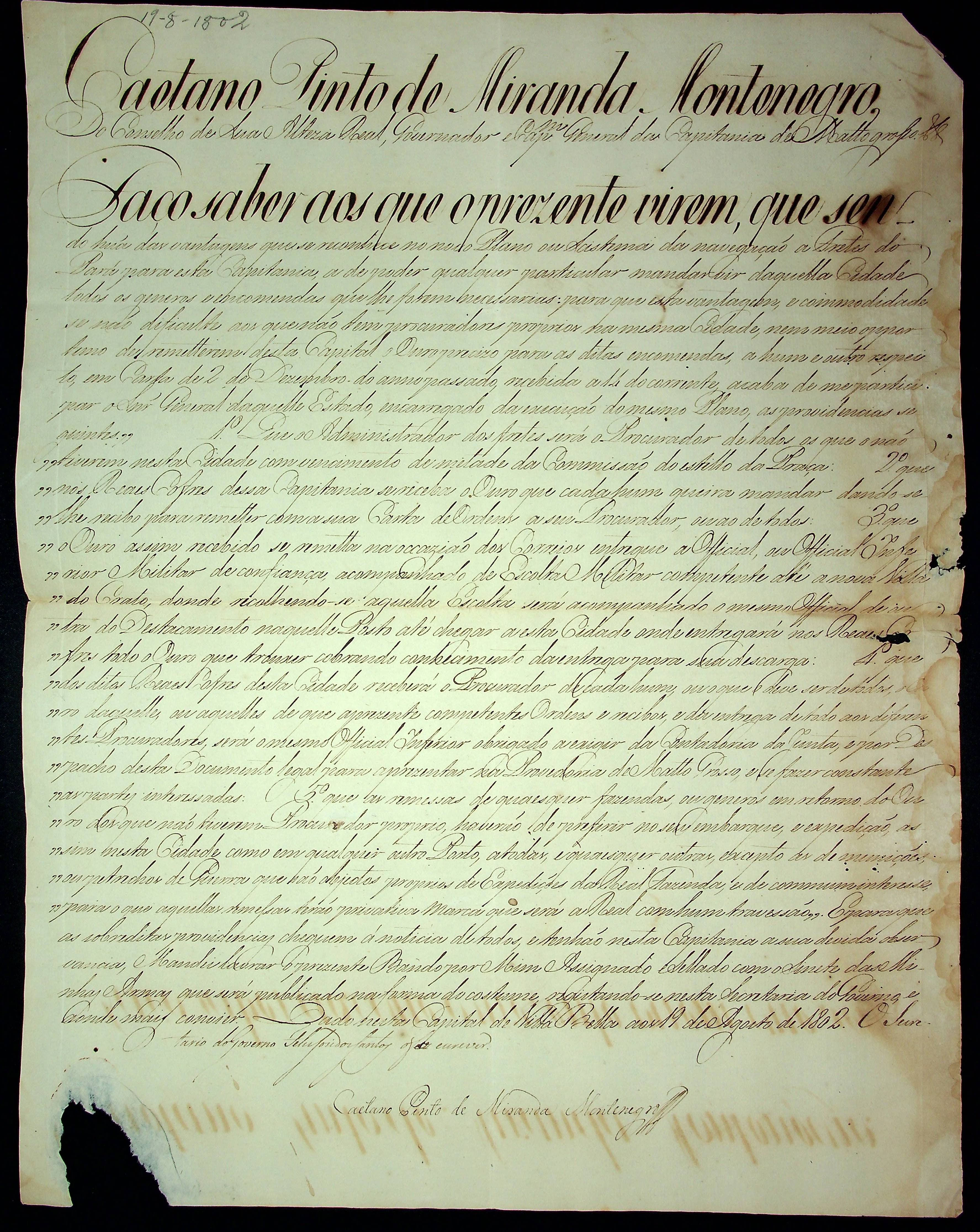 BANDO do Governador e Capitão General da Capitania de Mato Grosso Caetano Pinto de Miranda e Montenegro.