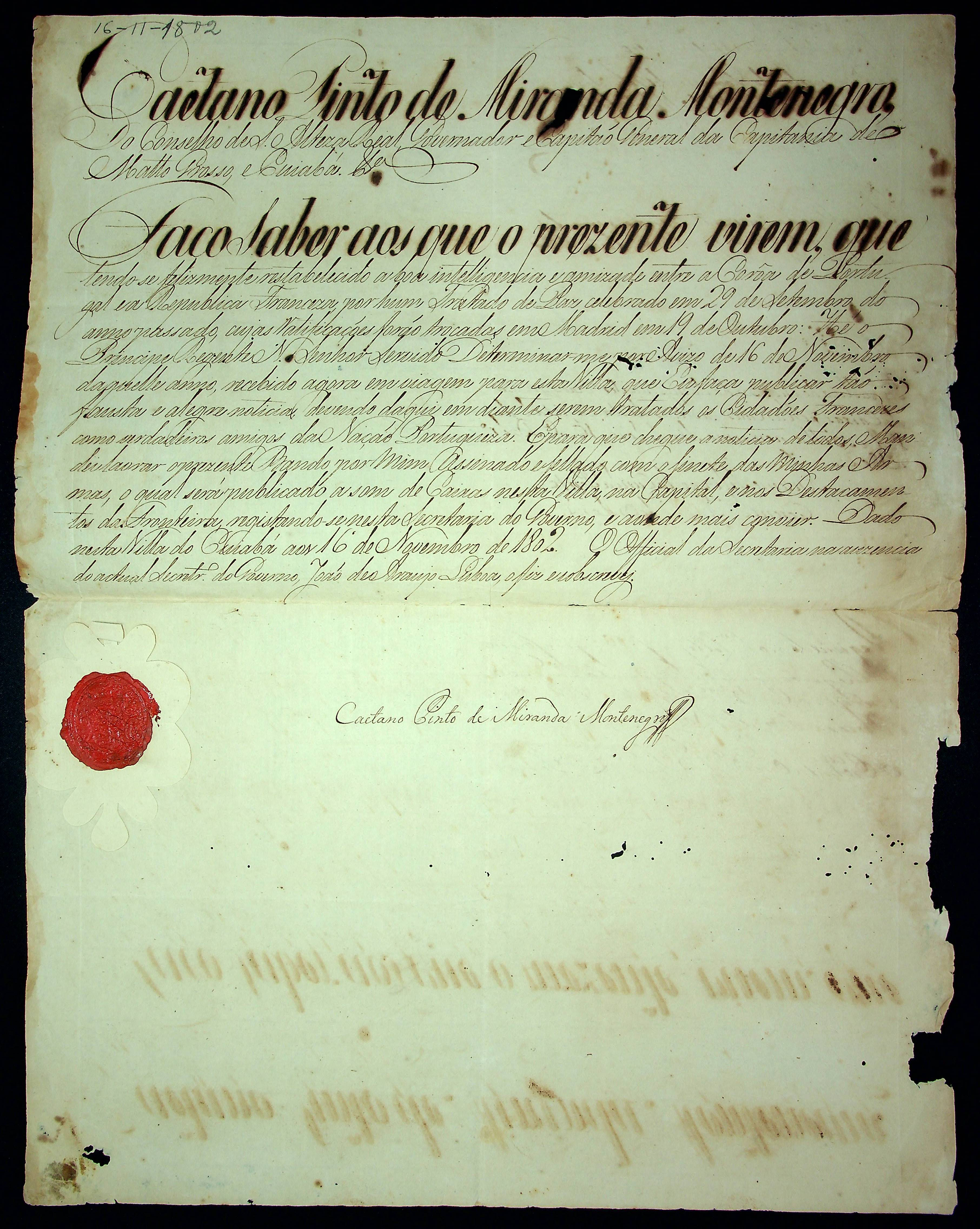 BANDO do Governador e Capitão General da Capitania de Mato Grosso Caetano Pinto de Miranda e Montenegro.