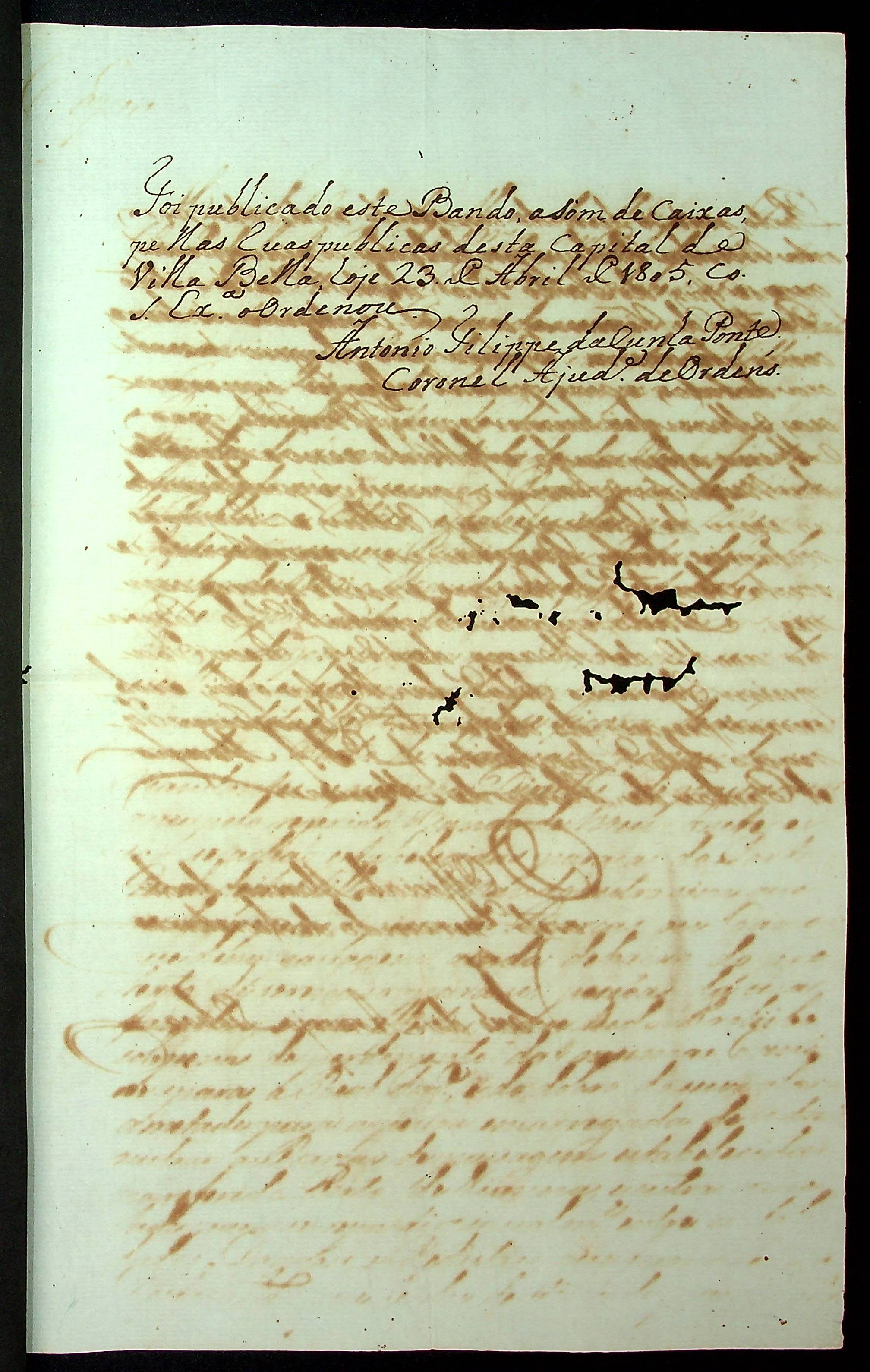 BANDO do Governador e Capitão General da Capitania de Mato Grosso Manoel Carlos de Abreu de Menezes.