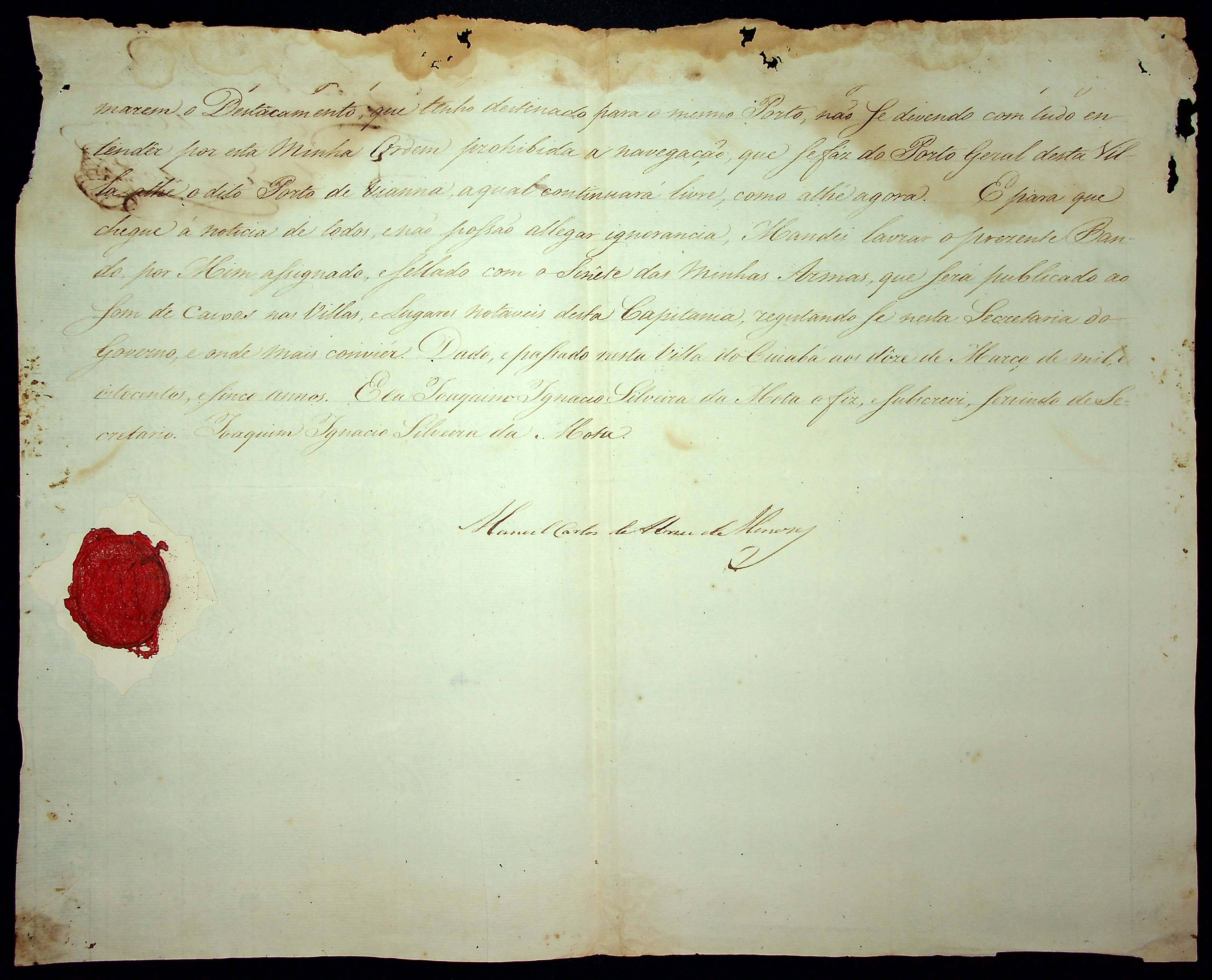 BANDO do Governador e Capitão General da Capitania de Mato Grosso Manoel Carlos de Abreu de Menezes.