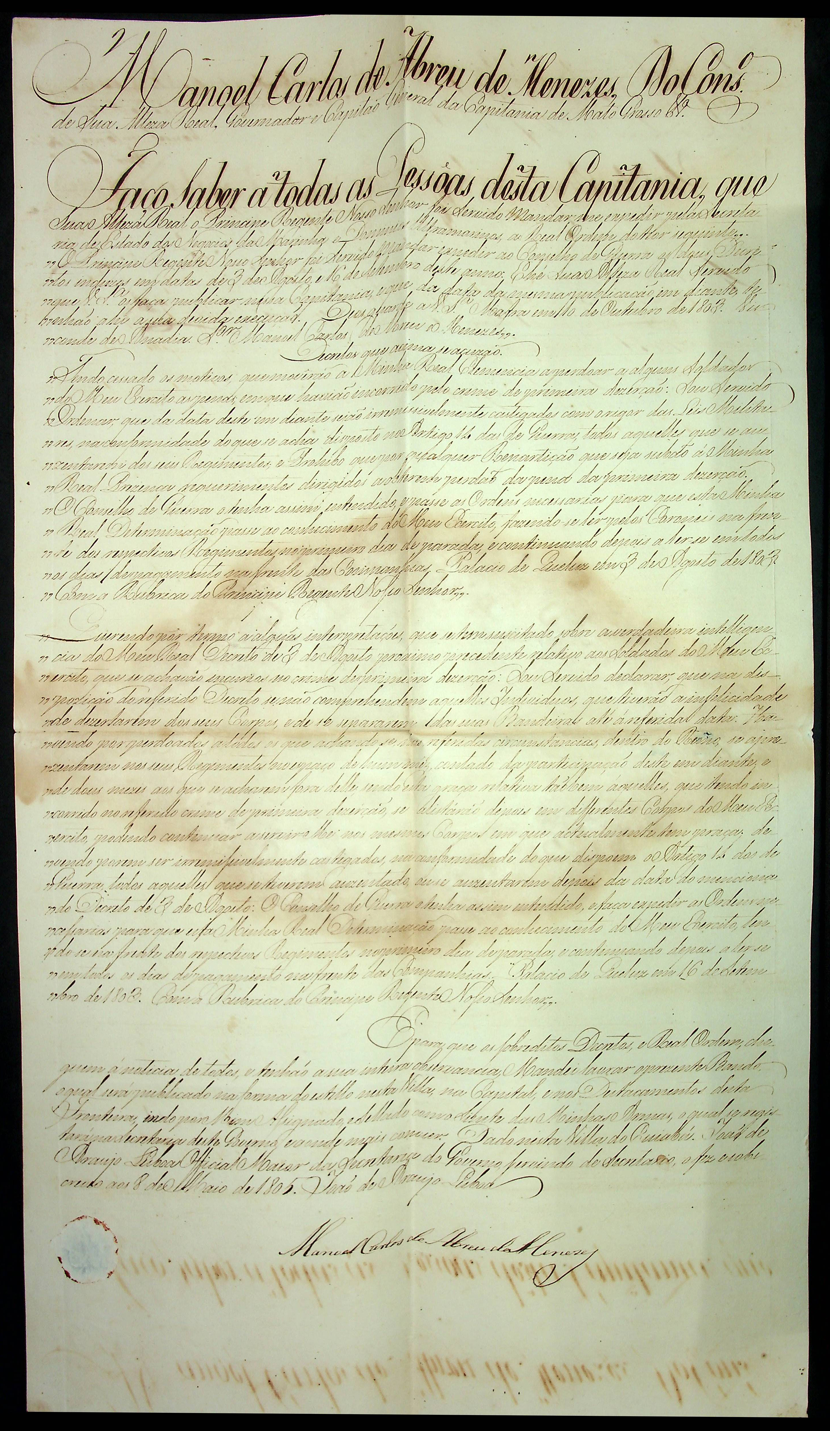 BANDO do Governador e Capitão General da Capitania de Mato Grosso Manoel Carlos de Abreu de Menezes.