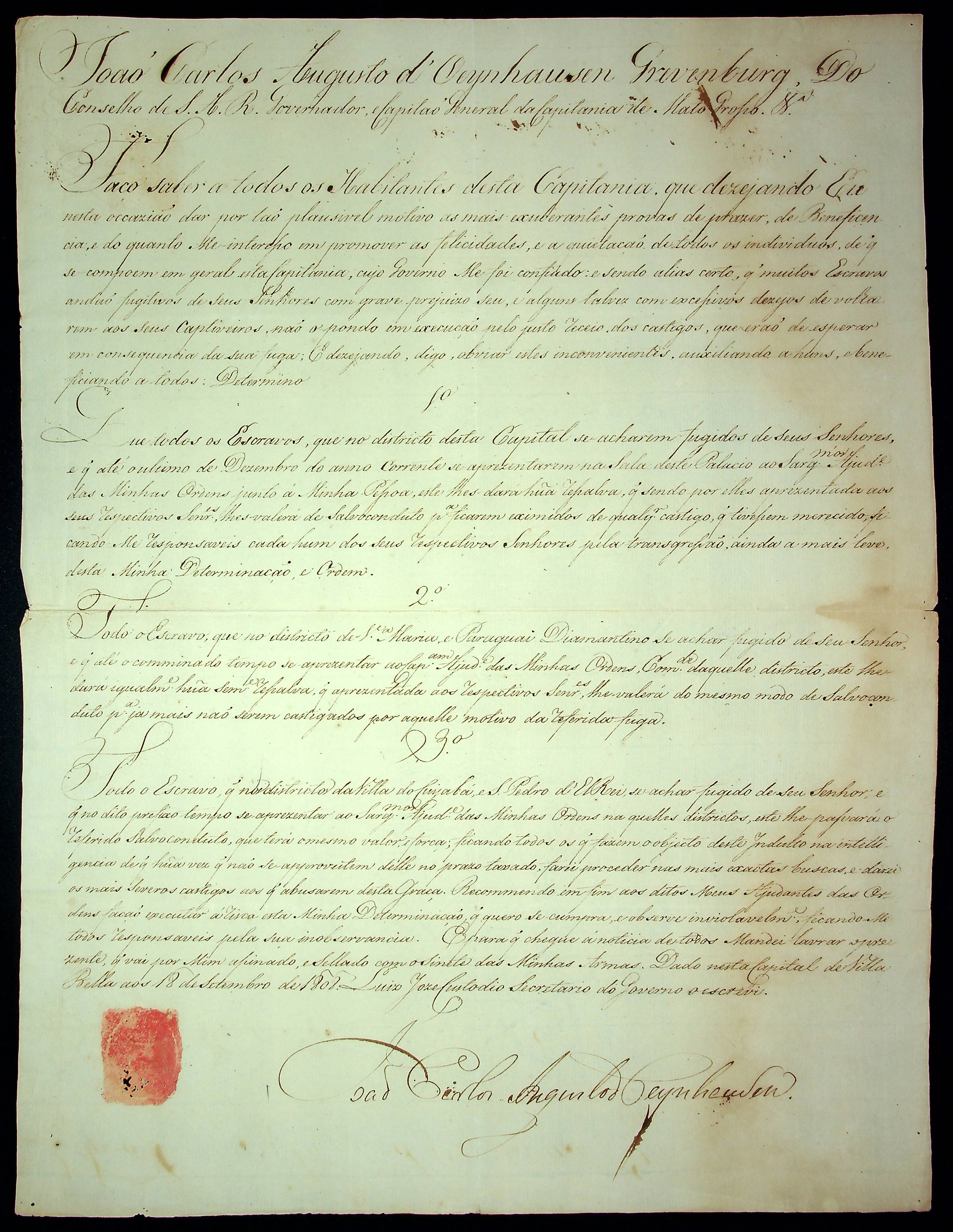 BANDO do Governador e Capitão General da Capitania de Mato Grosso João Carlos Augusto de Oeynhausen e Gravemberg.