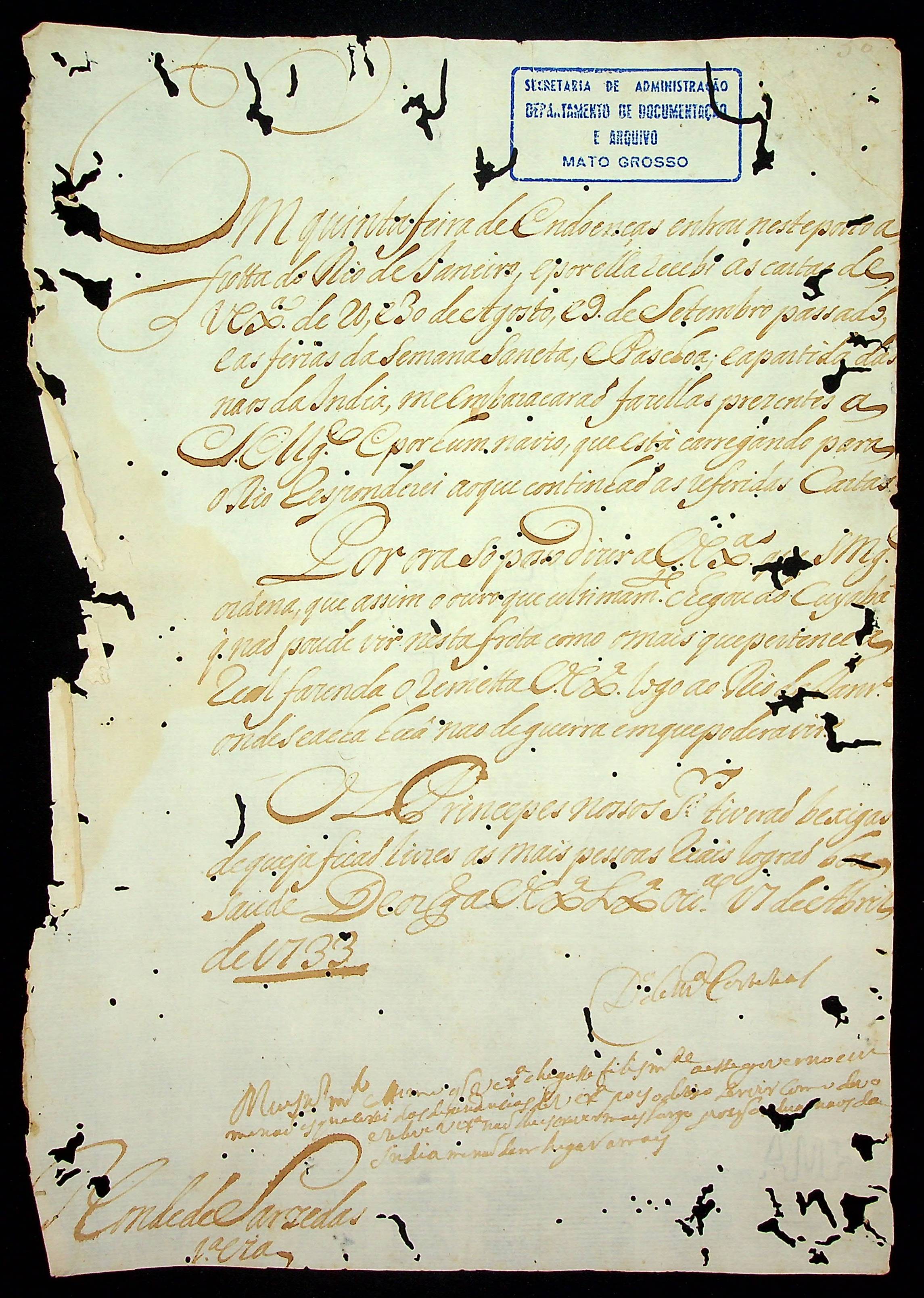 CARTA do [Secretário do Estado Ultramar] Diego de Mendonça da Corte Real ao Governador e Capitão-General da Capitania de São Paulo.