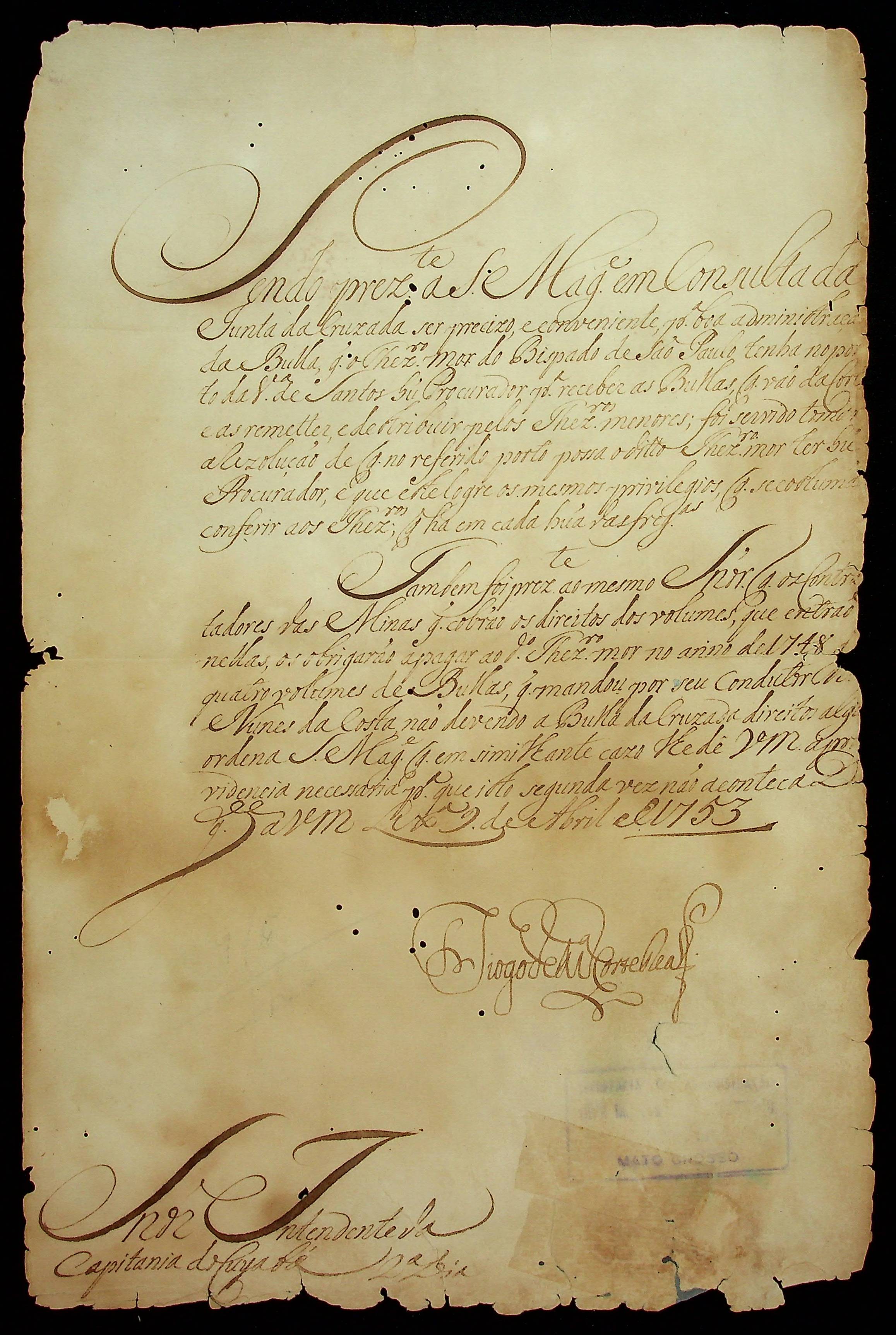 CARTA de Diogo Mendonça da Corte Real [Secretário de Estado da Marinha e Ultramar] ao [Governador e Capitão-General da Capitania de Mato Grosso] Antônio Rolim de Moura.