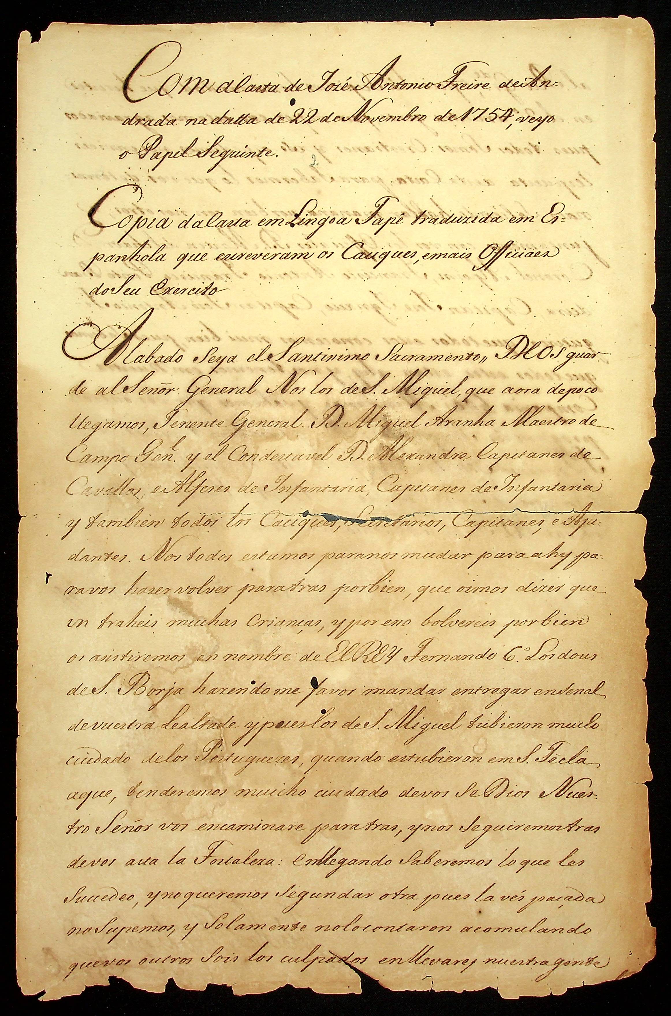 CARTA (Cópia) em língua tapé, traduzida em Espanhol que escrevem os Caciques e mais Oficiais de seu exército sobre a missão de São Miguel.