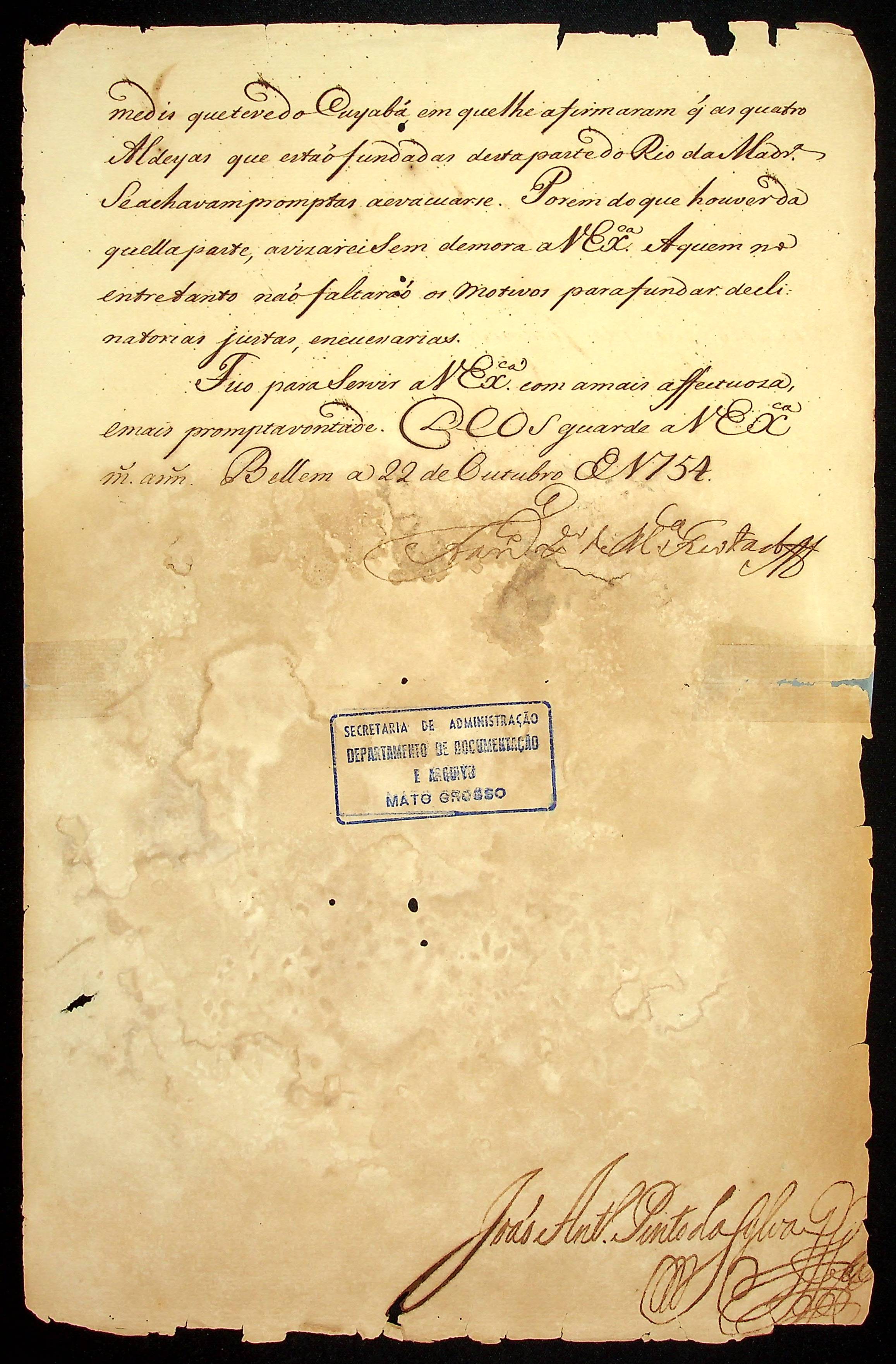 CARTA (Cópia) do Secretário de Estado José de Carvalho e Mello ao Governador e Capitão-General da Capitania de Mato Grosso Gomes Freire de Andrade.
