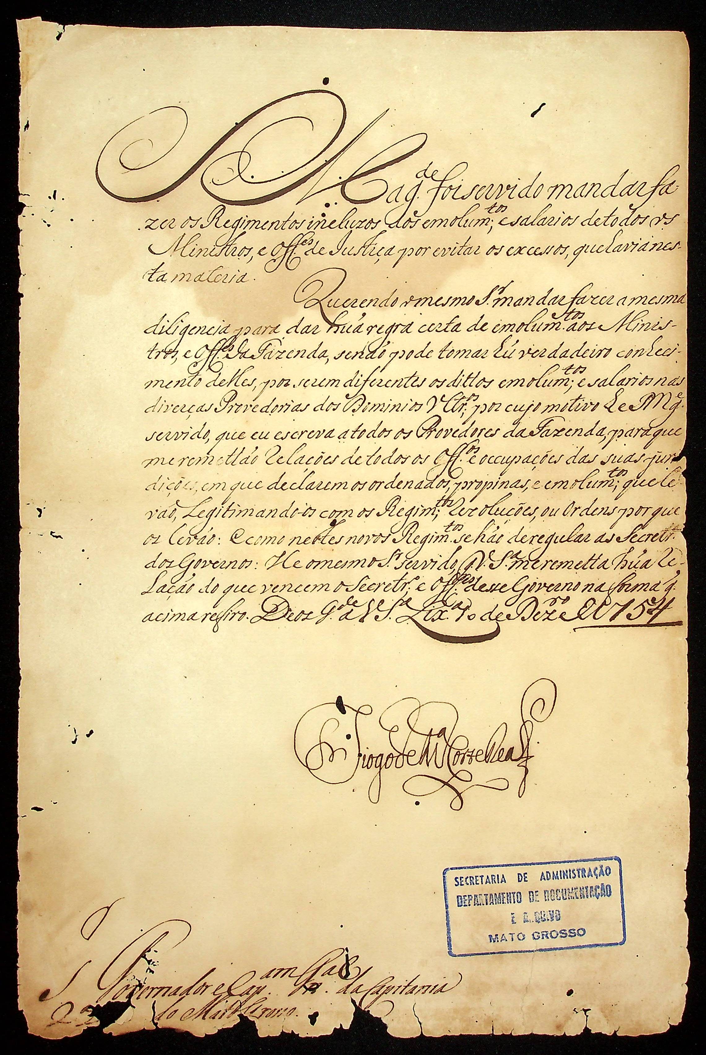 CARTA de Diogo de Mendonça Corte Real ao [Governador e Capitão-General e Capitania de Mato Grosso Antônio Rolim de Moura].
