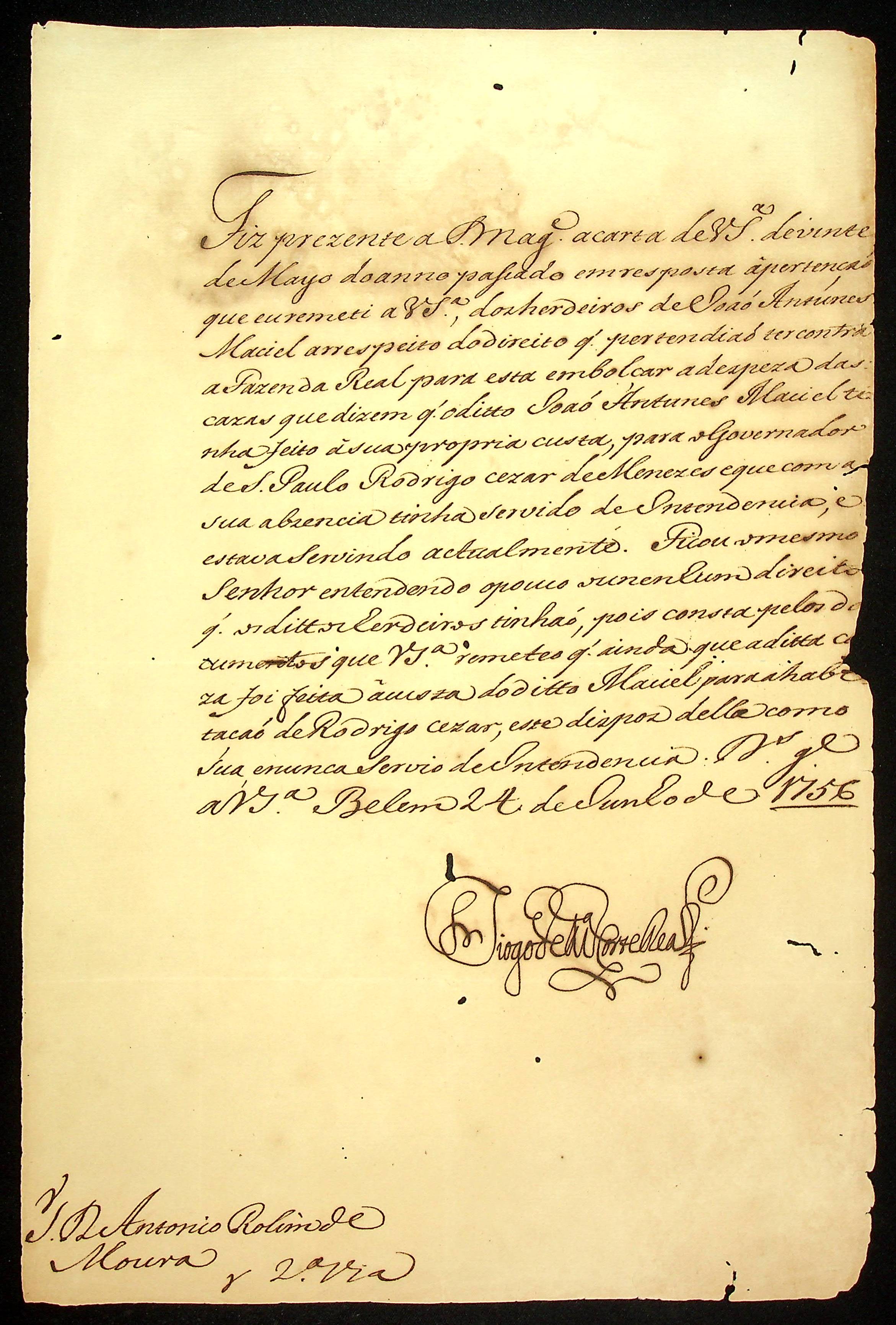 CARTA de Diogo Mendonça Corte Real ao [Governador e Capitão-General da Capitania de Mato Grosso] Antônio Rolim de Moura.