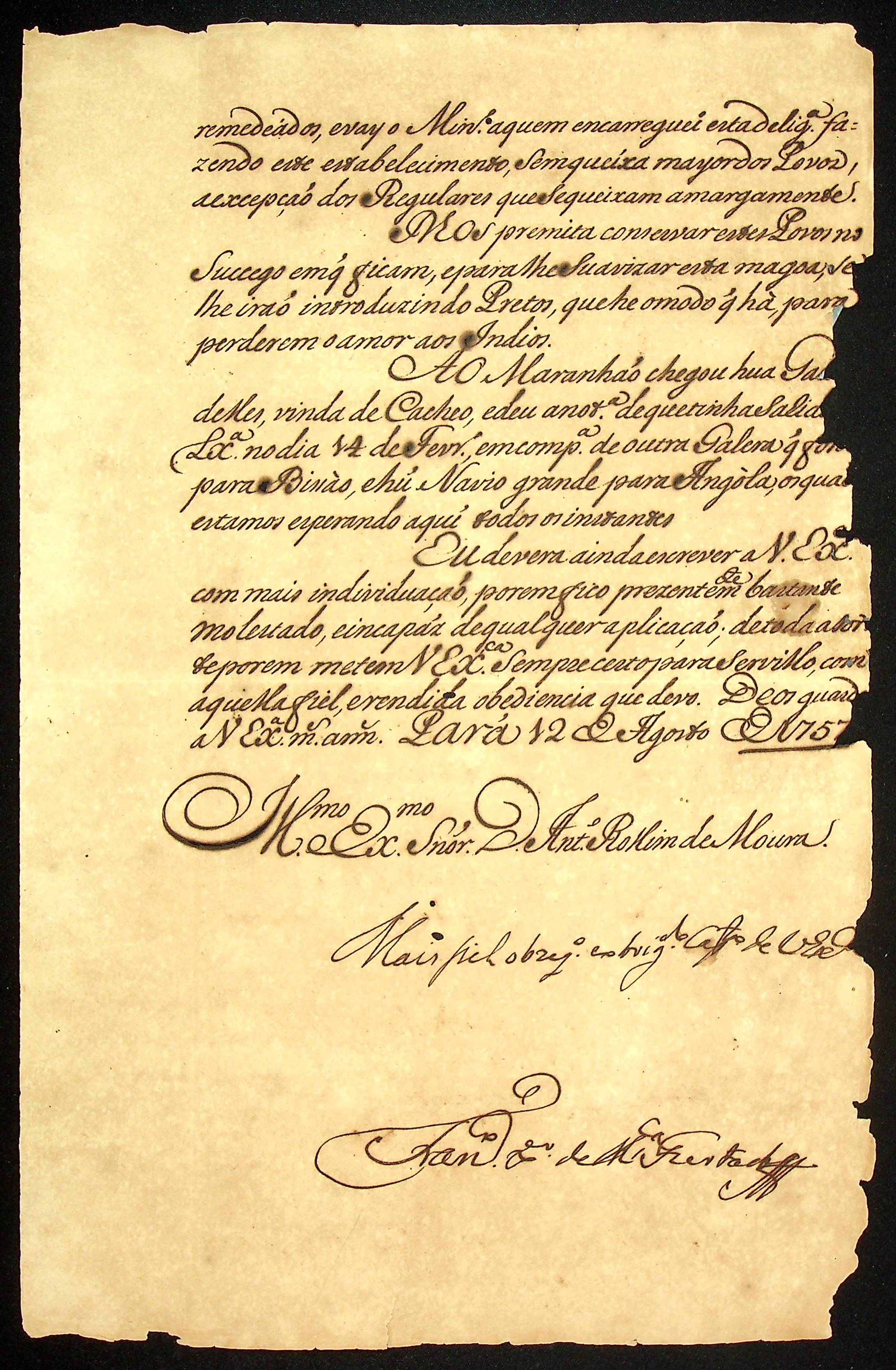 CARTA (incompleta) do [Governador e Capitão-General da Capitania do Pará] Francisco Xavier de Mendonça Furtado] ao [Governador e Capitão-General da Capitania de Mato Grosso] Antônio Rolim de Moura.