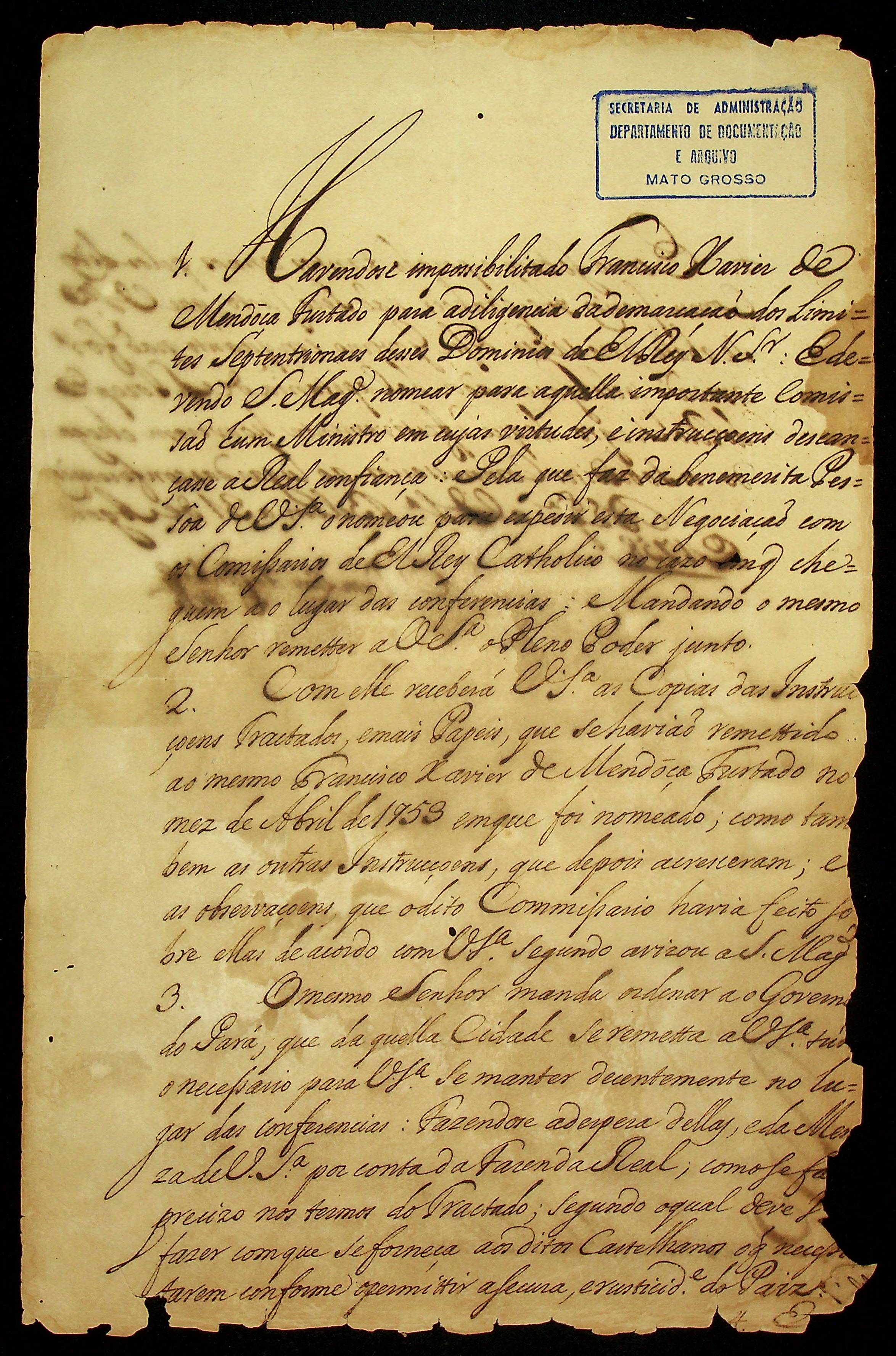 CARTA (incompleta) de Dom Luís da Cunha ao Governador e Capitão-General da Capitania de Mato Grosso Antônio Rolim de Moura.