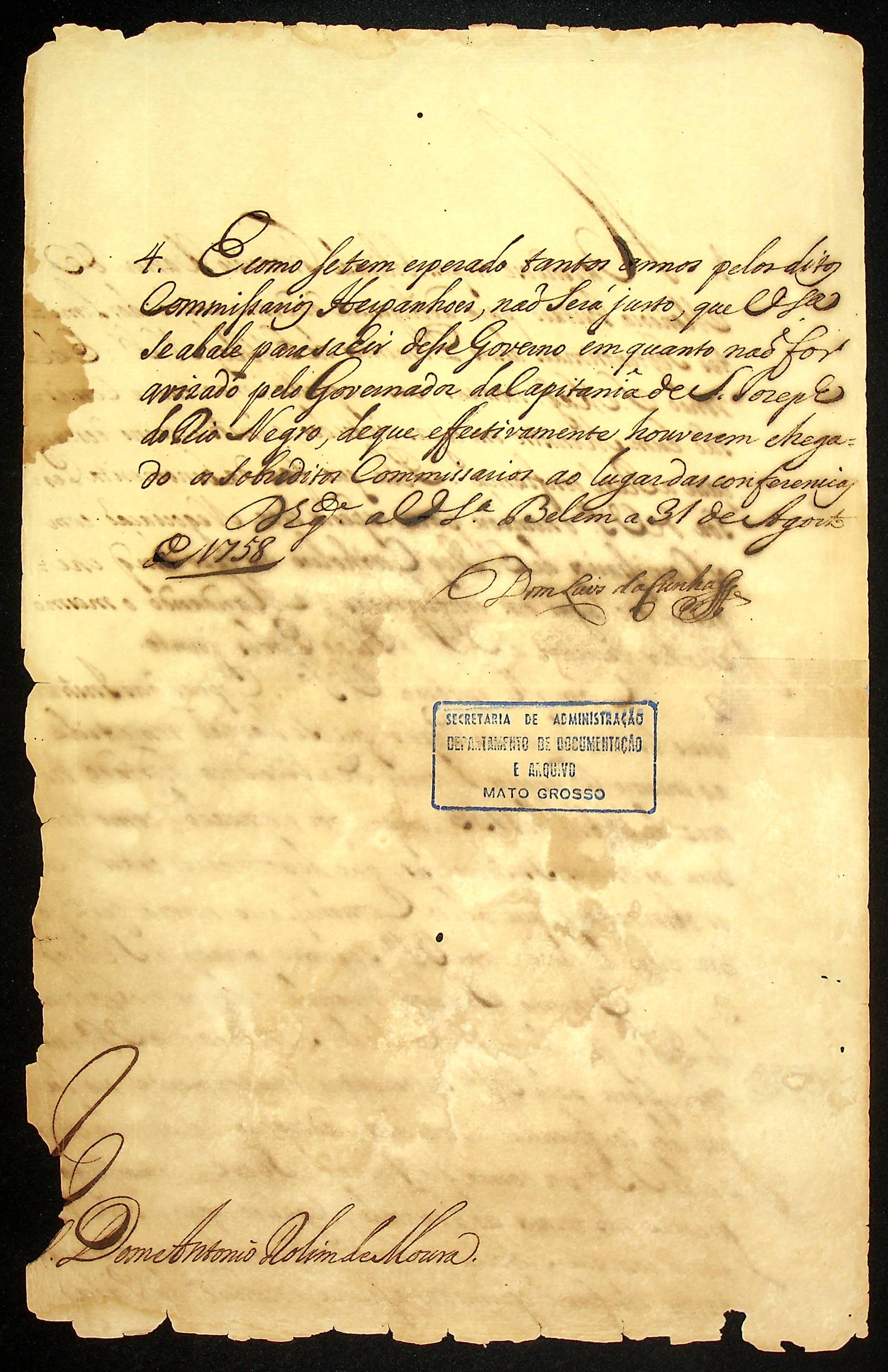 CARTA (incompleta) de Dom Luís da Cunha ao Governador e Capitão-General da Capitania de Mato Grosso Antônio Rolim de Moura.