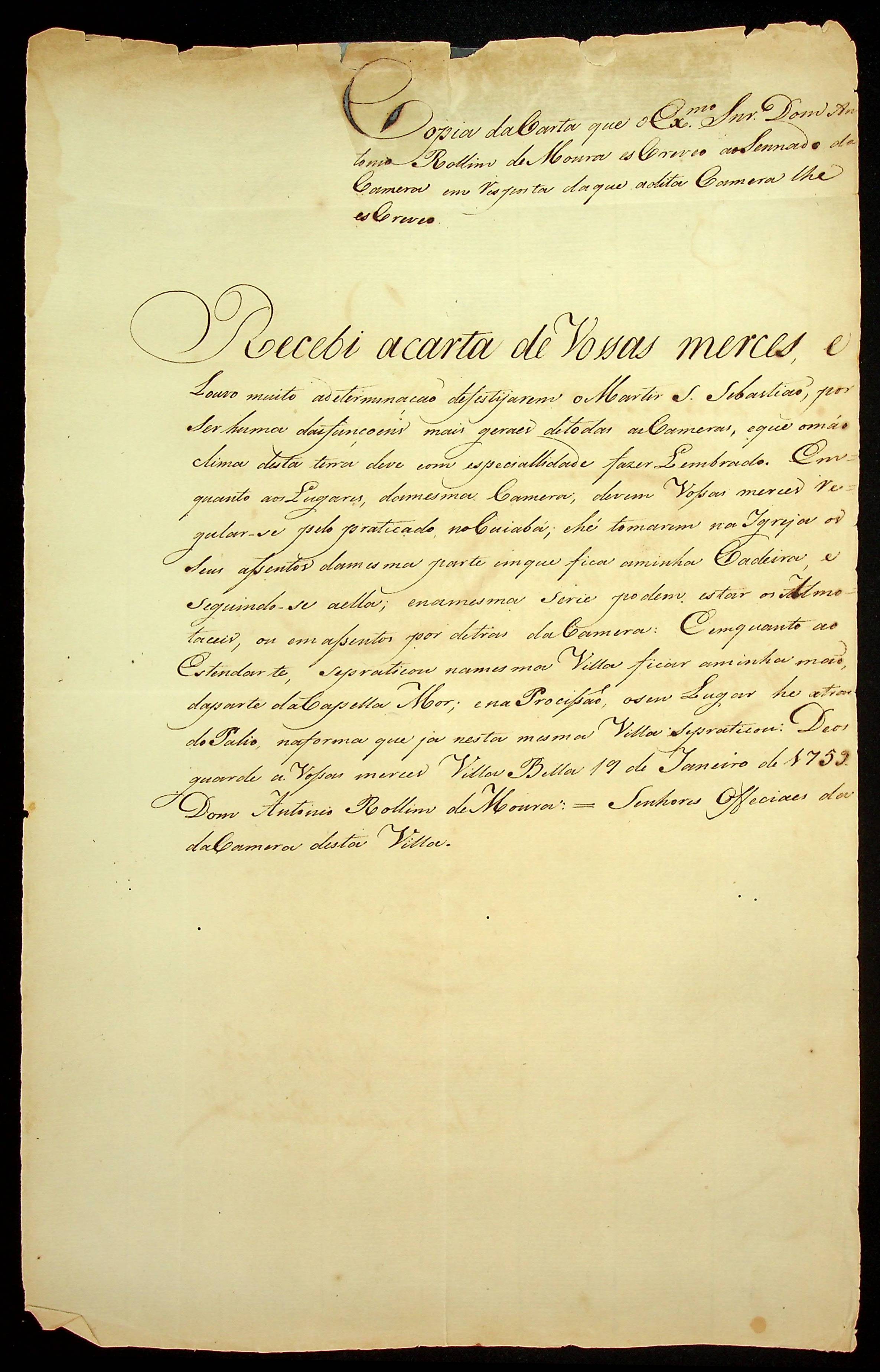 CARTA (Cópia) do [Governador e Capitão General da Capitania de Mato Grosso] Antônio Rolim de Moura ao Senado da Câmara de Vila Bela da Santíssima Trindade.