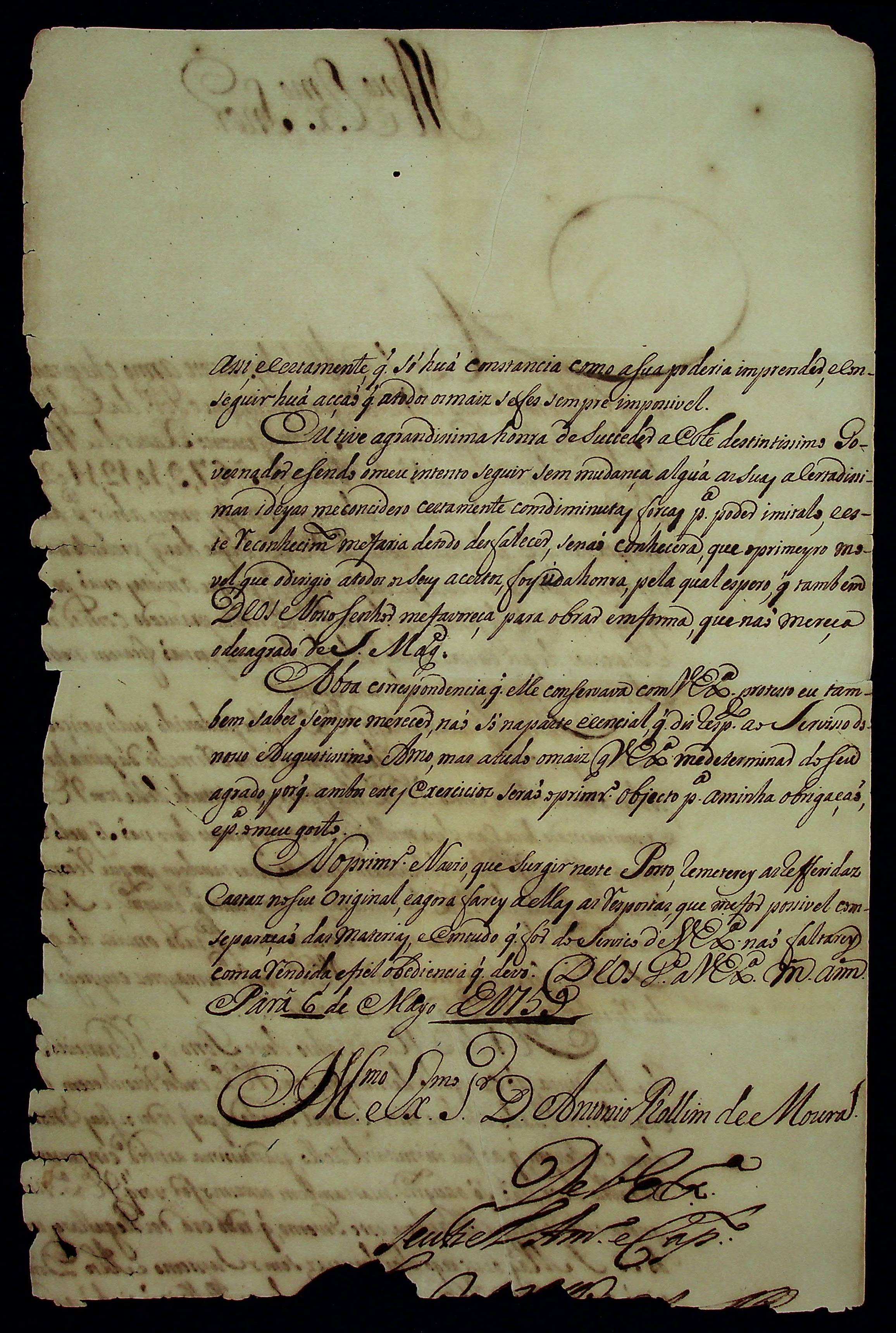 CARTA do [Governador e Capitão-General da Capitania do Pará] Manoel Bernardo de Mello de Castro ao [Governador e Capitão-General de Mato Grosso] Antônio Rolim de Moura.