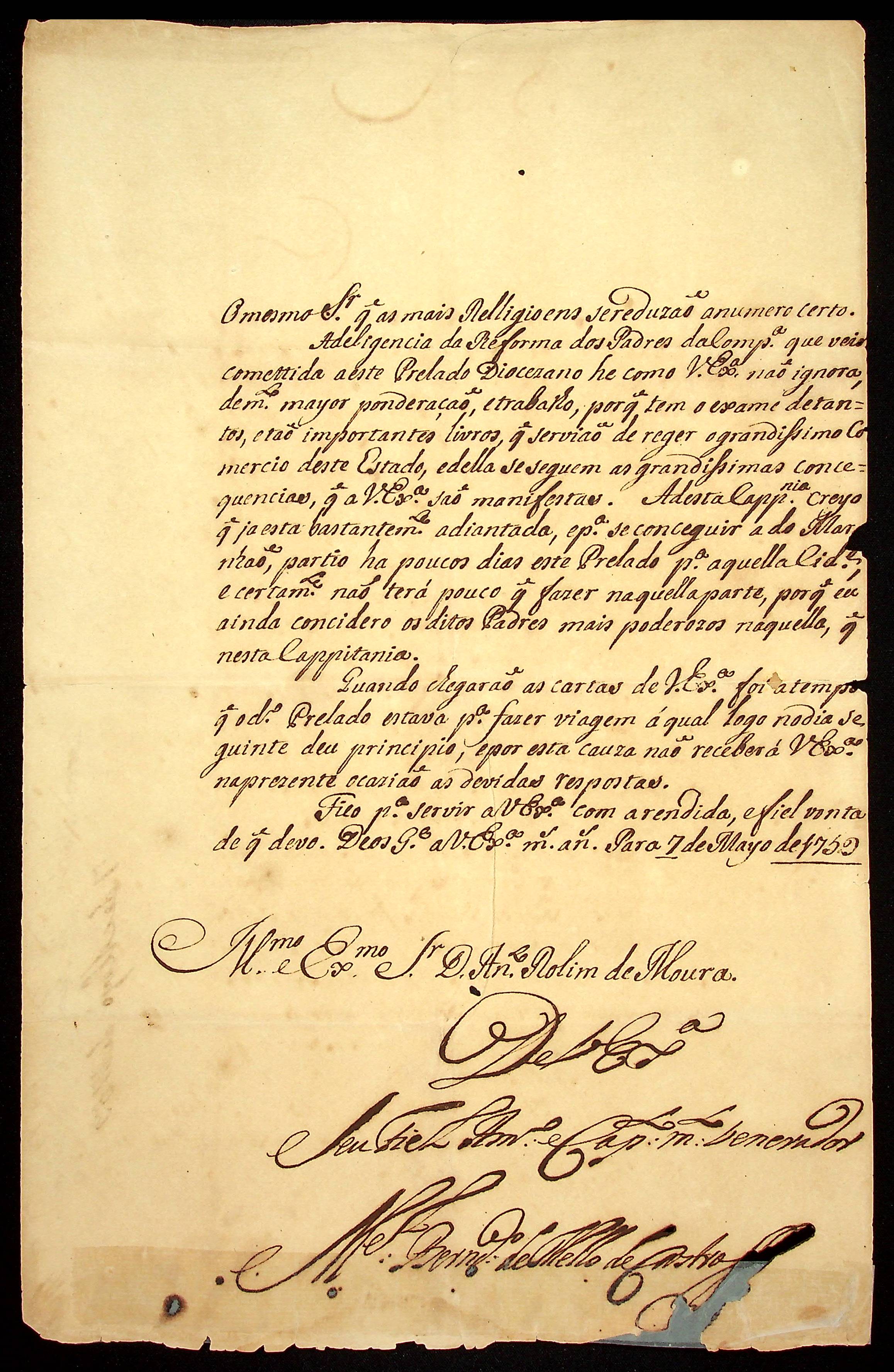 CARTA do [Governador e Capitão-General da Capitania do Pará] Manoel Bernardo de Mello e Castro ao [Governador e Capitão-General da Capitania de Mato Grosso] Antônio Rolim de Moura.