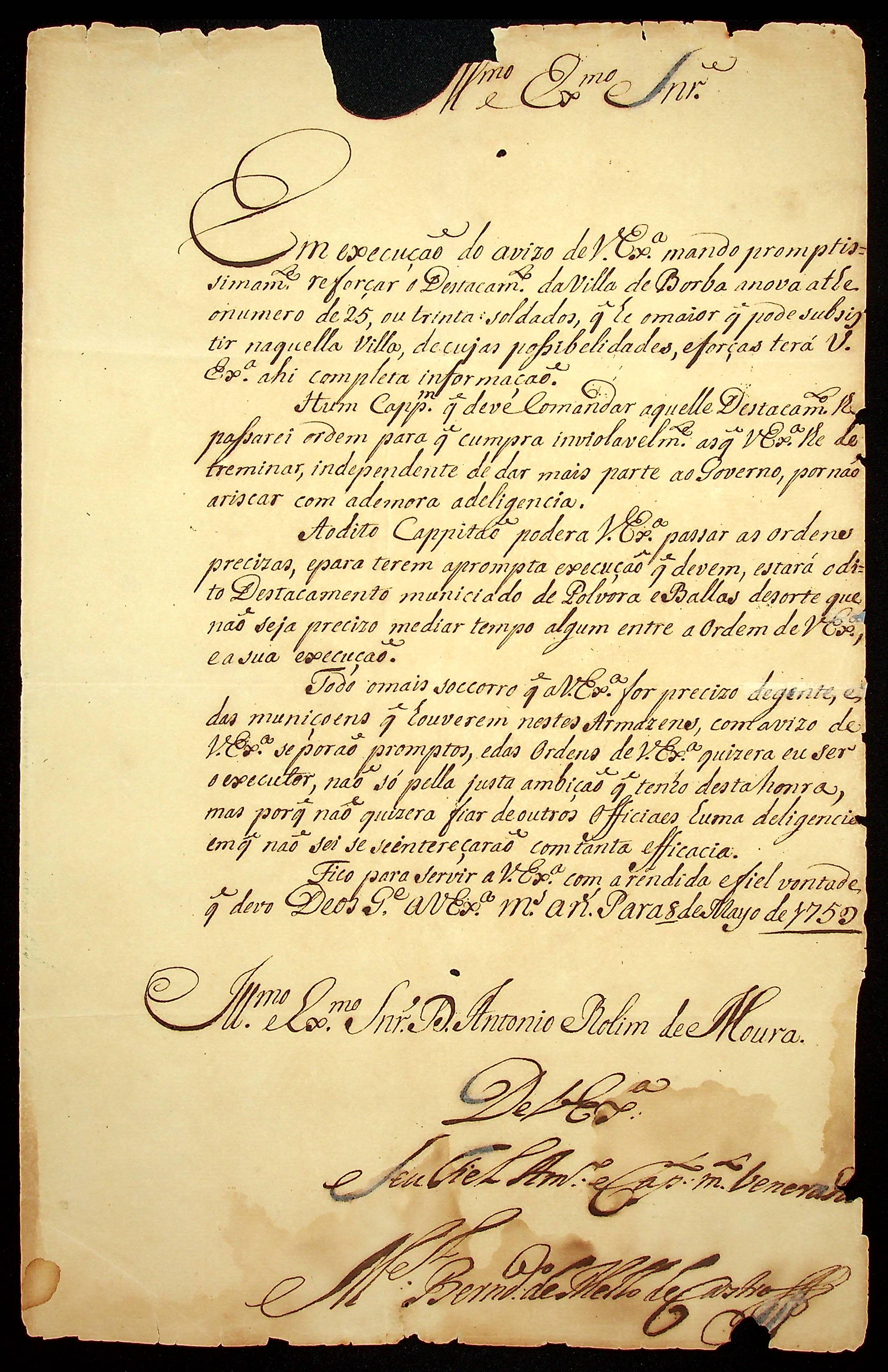 CARTA do [Governador e Capitão-General da Capitania do Grão-Pará e Maranhão] Manoel Bernardo de Mello e Castro ao [Governador e Capitão-General da Capitania de Mato Grosso] Antônio Rolim de Moura.