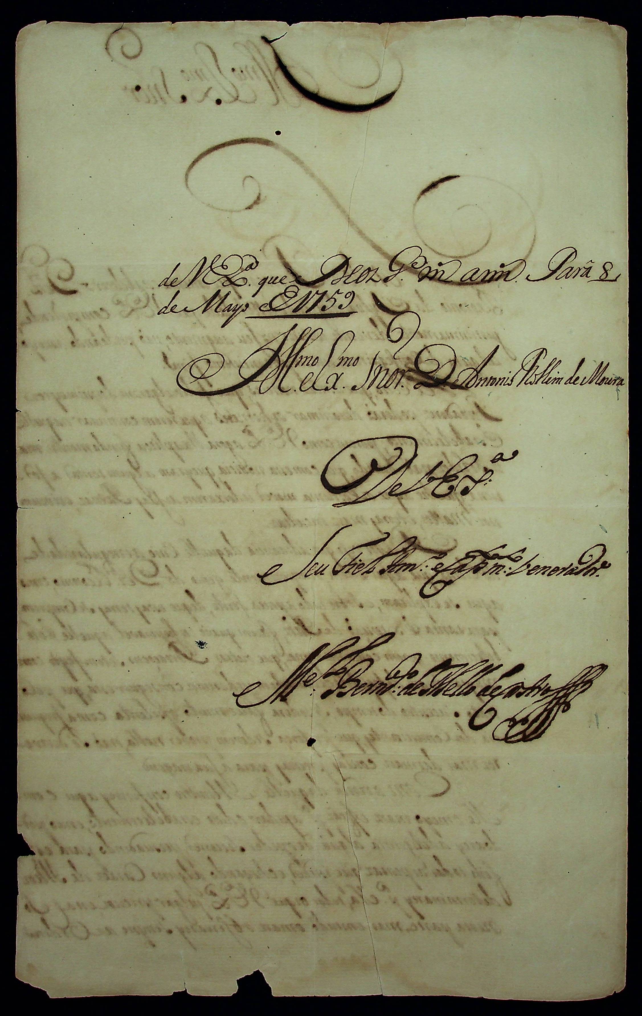 CARTA do [Governador e Capitão-General da Capitania do Grão Pará e Maranhão] Bernardo de Mello e Castro ao [Governador e Capitão-General da Capitania de Mato Grosso] Antônio Rolim de Moura.